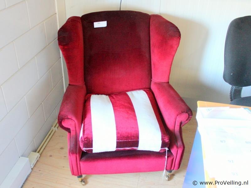 Klassieke oor fauteuil – rood velours Type comfortabele oor fauteuil / lounge fauteuil Bekleding rood velours / fluweelachtige stof Stijl klassiek model met hoge rugleuning en zijvleugels (oor fauteuil) Poten houten poten met messing wieltjes aan de voorzijde Comfort brede armleuningen en diepe zit Breedte ca. 84 cm Totale diepte ca. 90 cm Zithoogte ca. 42 cm Toepassing geschikt voor woonkamer, leeshoek of decoratief interieurstuk Conditie gebruikt (lichte gebruikssporen zichtbaar)