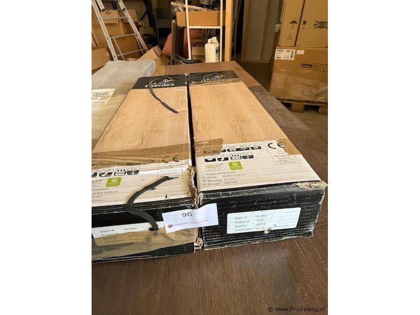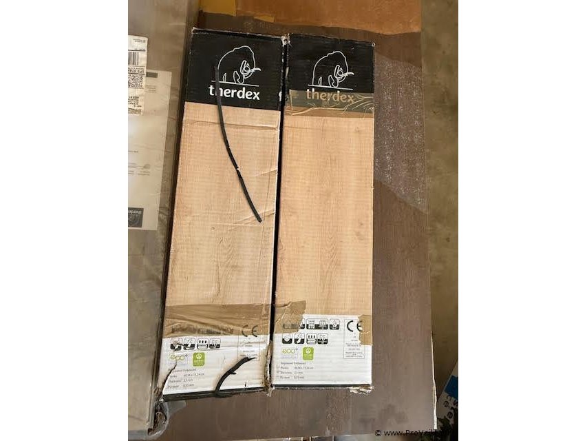 96 Therdex PVC visgraatvloer, kleur 7012/7042 Stijlvolle PVC visgraatvloer van het merk Therdex in de kleur 7012/7042. Deze vloer combineert de warme uitstraling van hout met de voordelen van PVC: onderhoudsvriendelijk, duurzaam en geschikt voor vloerverwarming. Afmetingen per plank: ca. 60,96 × 15,24 cm. Totaal: 2 pakken à 3,34 m² = ca. 6,68 m². Uitermate geschikt voor kleinere ruimtes of als uitbreiding/aanvulling op bestaande vloeren. Adviesprijs: ca. € 240,-