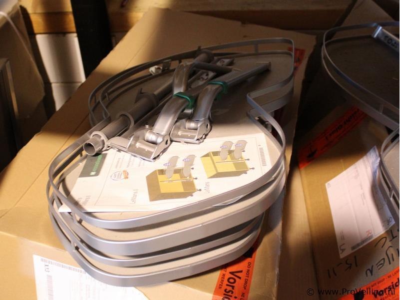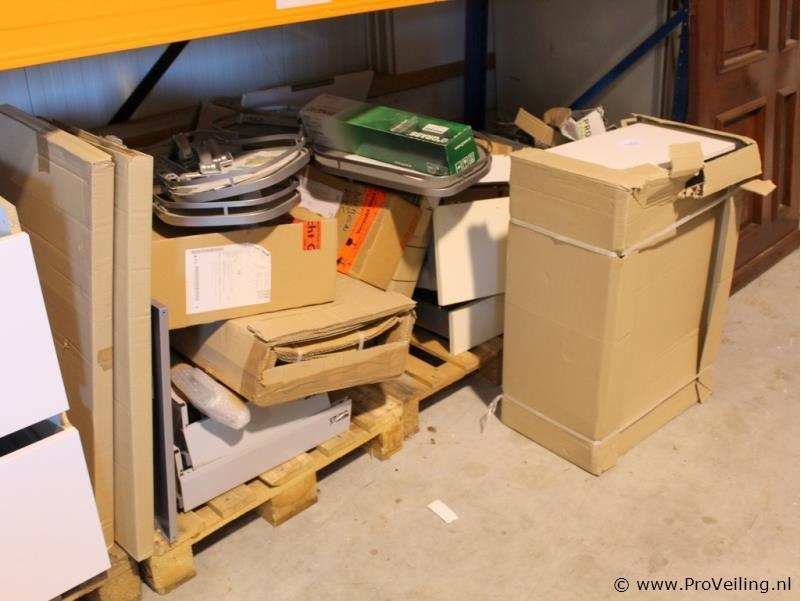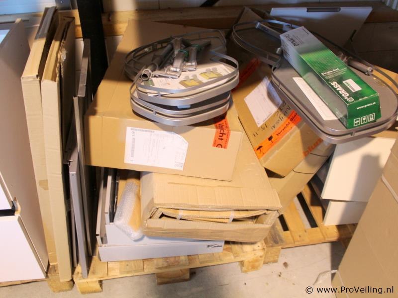 Partij keukenmaterialen en meubelbeslag – diverse onderdelen Gemengde partij keuken- en meubelonderdelen afkomstig uit keukeninstallaties. De partij bestaat uit diverse ladecomponenten, meubelbeslag, kastonderdelen en accessoires. Onder andere zichtbaar zijn uittreksystemen, ladegeleiders, frontpanelen en montagemateriaal. Inhoud o.a. Uittrekbare hoekkastsystemen (o.a. type LeMans) Ladebakken en ladefronten Ladegeleiders en rails Meubelbeslag en montagemateriaal Diverse keukenonderdelen en accessoires Merken Onder andere onderdelen van Grass (Dynapro / LeMans systemen) zichtbaar. Kenmerken Mix van nieuwe en gebruikte onderdelen – geschikt voor keukenmontage, reparatie of onderdelen – ideaal voor keukenmonteur of handelaar – verkoop als partij zoals afgebeeld. Opmerking Verkoop betreft een gemengde partij keukenmaterialen. Inhoud en aantallen niet exact geteld.
