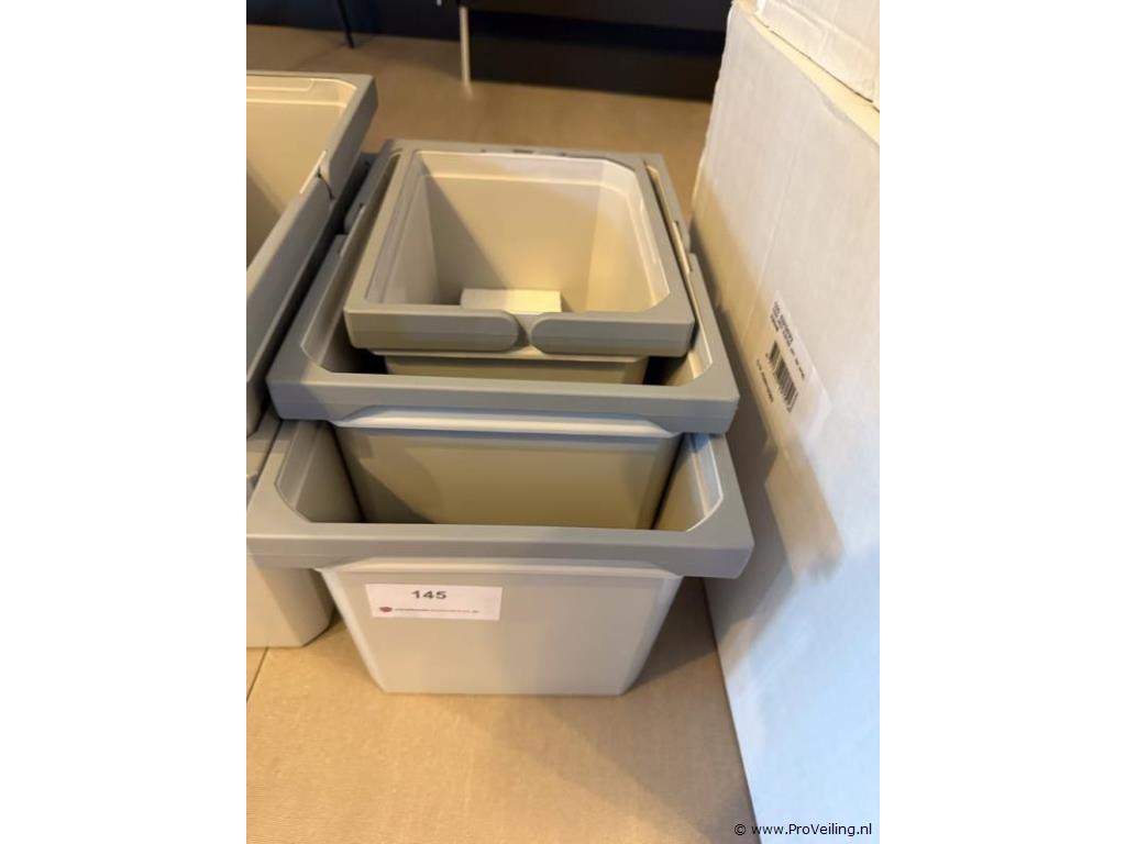 Productnaam: Set van 3 afvalemmers Productbeschrijving: Praktische set van drie losse afvalemmers, uitgevoerd in grijs kunststof. Geschikt voor inbouwsystemen of los gebruik in keuken of berging. Afmetingen: 1 emmer ca. 19 × 23 × 22 cm, 1 emmer ca. 30 × 23 × 22 cm en 1 emmer ca. 38 × 23 × 22 cm. Conditie: Gebruikt