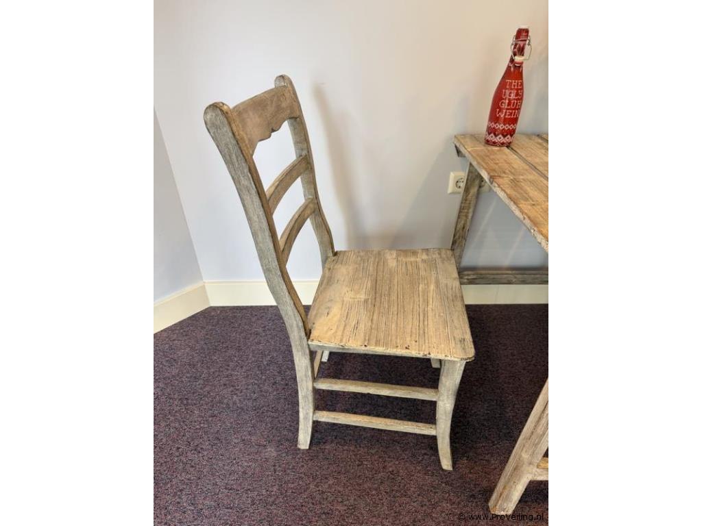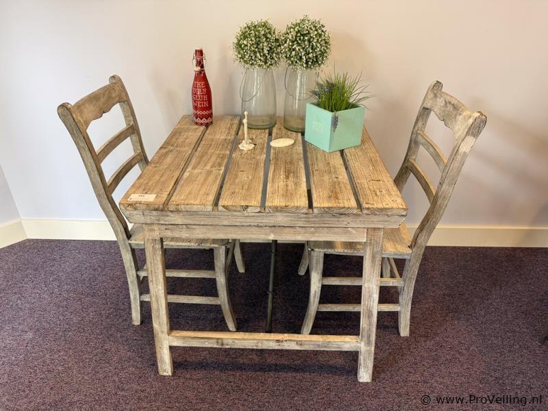 Productnaam: Eethoek – tafel met 2 stoelen Omschrijving: Compacte houten eethoek bestaande uit een rechthoekige tafel en twee bijpassende stoelen. Authentiek en landelijk ontwerp met een doorleefde uitstraling. Geschikt voor kleinere ruimtes of als ontbijthoek. Uitvoering: Houten tafel met 2 stoelen Conditie: Gebruikt, met zichtbare gebruikssporen