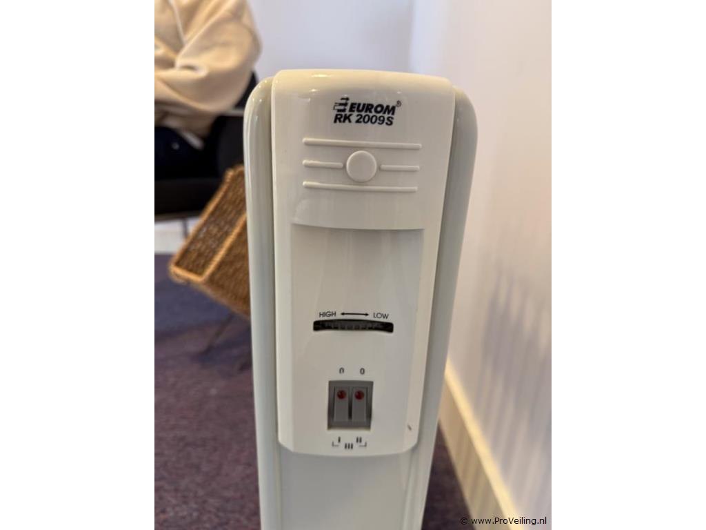Productnaam: Oliegevulde radiatorkachel Merk: Eurom Model: RK2009S Type: Oliegevulde radiatorkachel op wielen Kenmerken: 9 lamellen Vermogen ca. 2.000 W (meerdere standen) Regelbare thermostaat Oververhittings- en kantelbeveiliging Verrijdbaar op zwenkwielen Kleur: lichtgrijs Conditie: Gebruikt, werkend aangetroffen