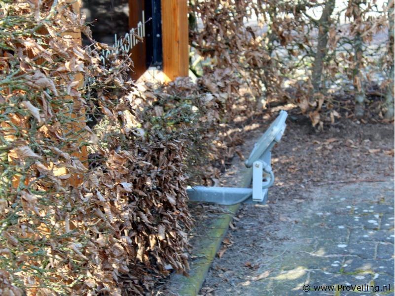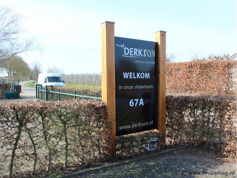 Buitenreclamebord met houten palen en LED verlichting Vrijstaand buitenreclamebord met stevige houten palen en geïntegreerde LED-schijnwerper voor verlichting van het bord. Geschikt voor bedrijfsreclame, erf- of terreinmarkering. Het bord is robuust uitgevoerd en bedoeld voor plaatsing buiten. Kenmerken Type: vrijstaand buitenreclamebord Constructie: houten staanders met reclamepaneel Breedte bord: ca. 165 cm Totale hoogte palen: ca. 275 cm Verlichting: LED schijnwerper onderaan gemonteerd Toepassing: bedrijfsreclame / terreinbord / entreebord Gebruikte staat Opmerking Zelf demonteren en afvoeren. Ter plaatse is een heftruck aanwezig om te helpen de palen uit de grond te liften.