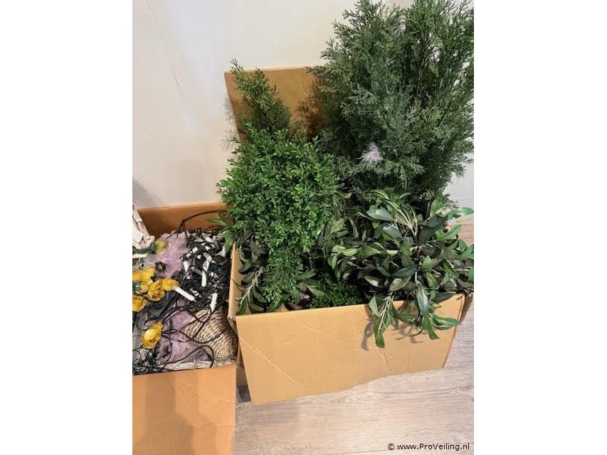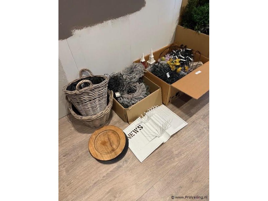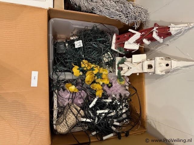 Kerstverlichting en decoratie (partij) Omschrijving Partij kerstverlichting en decoratieve artikelen bestaande uit diverse lichtsnoeren, decoratieve objecten, manden en kunstgroen. Geschikt voor decoratie van woning, winkel, horeca of showroom. Kenmerken • Type kerstverlichting en decoratie • Inhoud diverse lichtsnoeren en decoratieve elementen • Inclusief manden, decoratieve objecten en kunstplanten • Toepassing kerst- en seizoen decoratie • Conditie gebruikt / decoratiemateriaal in partij
