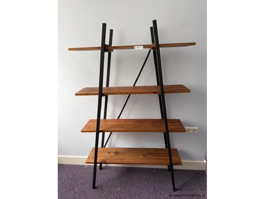 Wandrek met stalen frame en massief houten legplanken Omschrijving Wandrek uitgevoerd met zwart stalen frame en vier massief houten legplanken. Geschikt voor gebruik als opberg- of decoratierek in woning, kantoor of showroomruimte. Kenmerken • Type wandrek • Frame staal, zwart uitgevoerd • Legplanken 4 massief houten planken • Toepassing geschikt voor opslag of decoratieve opstelling • Afmetingen ca. 100 × 162 × 30 cm (breedte × hoogte × diepte) Ter waarde van: € 250