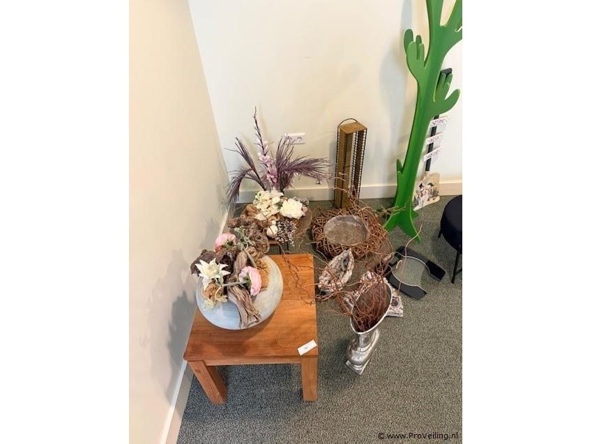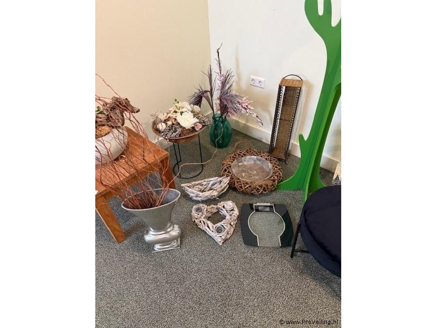 Partij diverse woonaccessoires Omschrijving Gevarieerde partij woonaccessoires bestaande uit onder andere decoratieobjecten, vazen, manden, een poef, bijzettafel en een kapstok. Geschikt voor gebruik in woning, showroom of etalage. Kenmerken • Type diverse woonaccessoires • Inhoud o.a. decoratieobjecten, vazen, manden, bijzettafel, poef en kapstok • Uitvoering diverse materialen en stijlen • Toepassing geschikt voor decoratie in woning, kantoor of showroom • Conditie gebruikt / showroomstaat