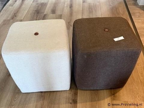 Poefen stof bruin / wit (2 stuks) Omschrijving Set van twee gestoffeerde poefen uitgevoerd in verschillende kleuren stof. Geschikt als zitpoef, voetenbank of decoratief meubelstuk in woonkamer, kantoor of showroomruimte. Kenmerken • Type poef / zitpoef • Bekleding stof • Kleuren 1× wit en 1× bruin • Aantal 2 stuks • Afmetingen ca. 45 × 45 × 44 cm Ter waarde van: € 180