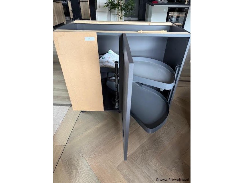 Le-Mans hoekkast met 2 uitzwenkbare plateaus Omschrijving Hoekkast voorzien van een Le-Mans binnenwerk met twee uitzwenkbare plateaus voor optimale benutting van de hoekkastruimte. Uitgevoerd met gelakt eiken front en messing greep. Kenmerken • Type Le-Mans hoekkast • Front eiken gelakt • Greep messing • Opbergsysteem Le-Mans mechanisme met 2 uitzwenkbare plateaus • Toepassing keuken hoekkast met optimale bereikbaarheid van de opbergruimte • Afmetingen ca. 100 × 65 × 90 cm (breedte × diepte × hoogte)