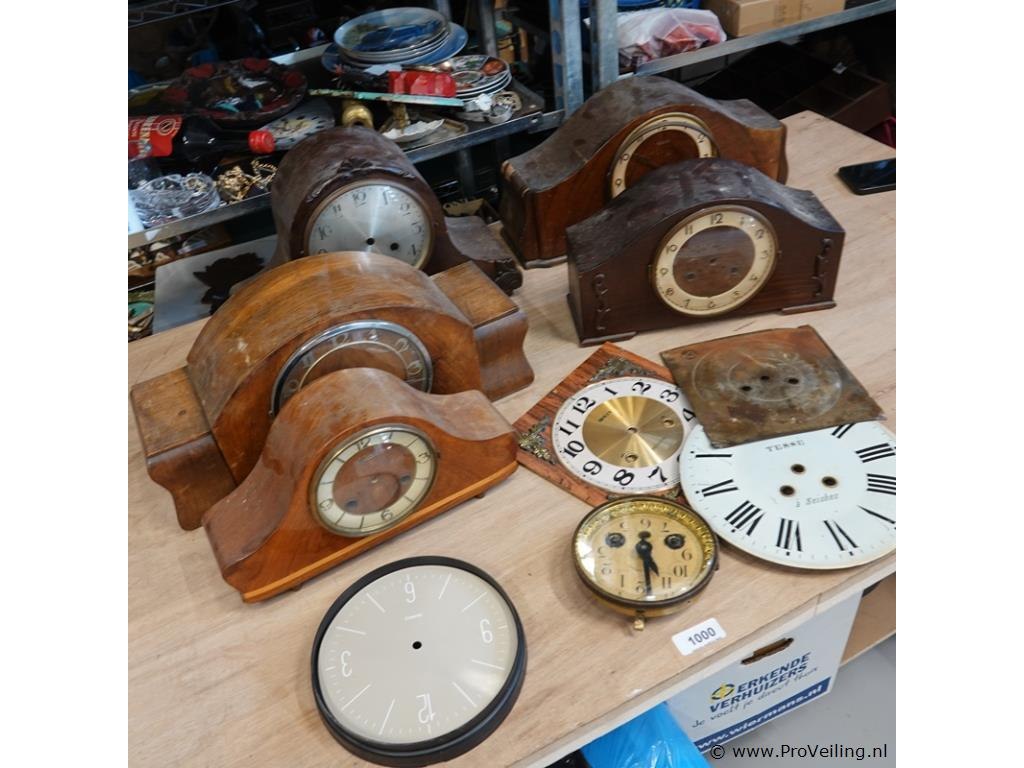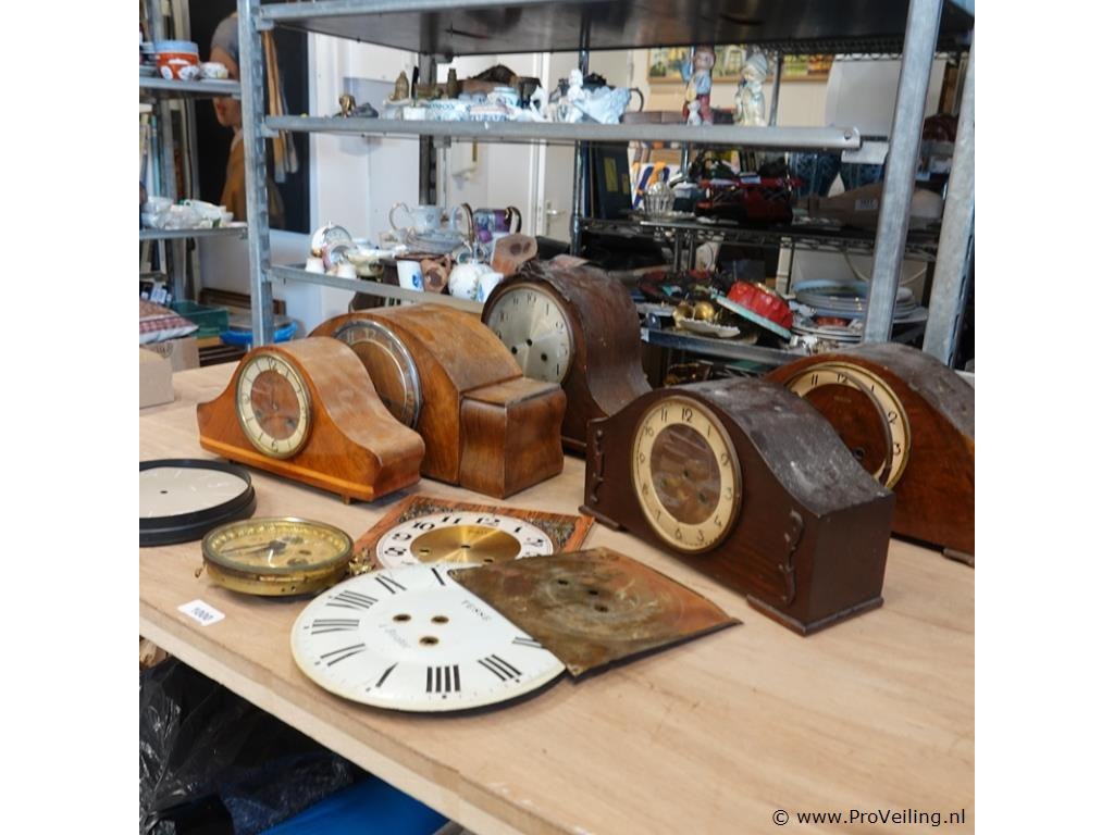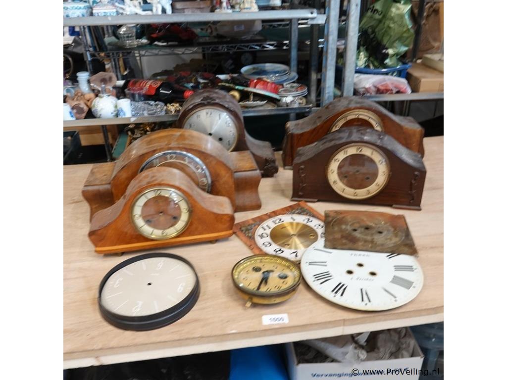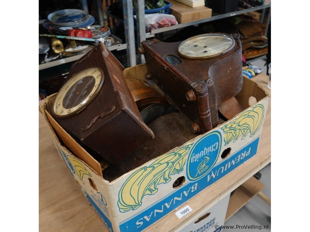 Partij klokkasten en klokonderdelen in doos