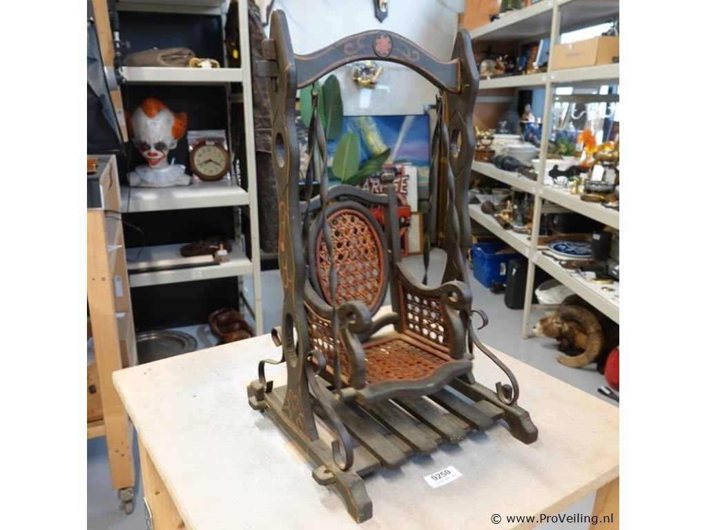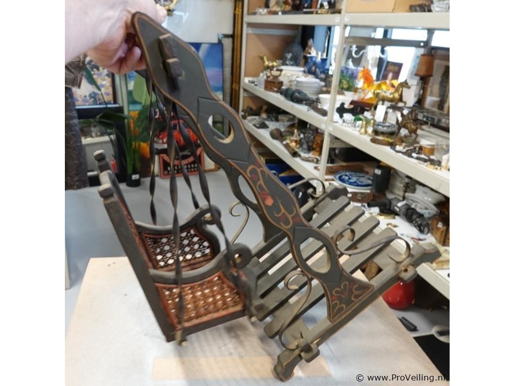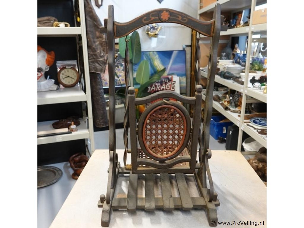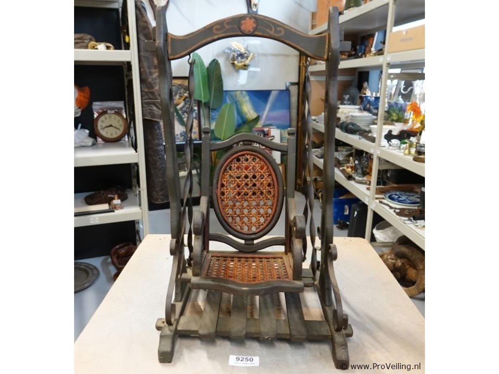 Antieke houten poppenschommel, begin 20e eeuw. Hout, rotan en metaal. H52cm/L32cm/B30cm/1000Gr. Lees a.u.b. ook de extra veilinginformatie voor deze veiling. G-E-E-N transport of bezorging door Proveiling mogelijk. Eventueel transport of bezorging alleen door u zelf te regelen via b.v. www.brenger.nl .