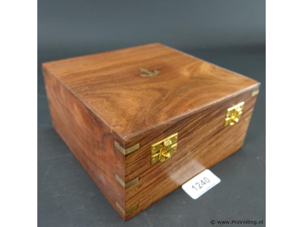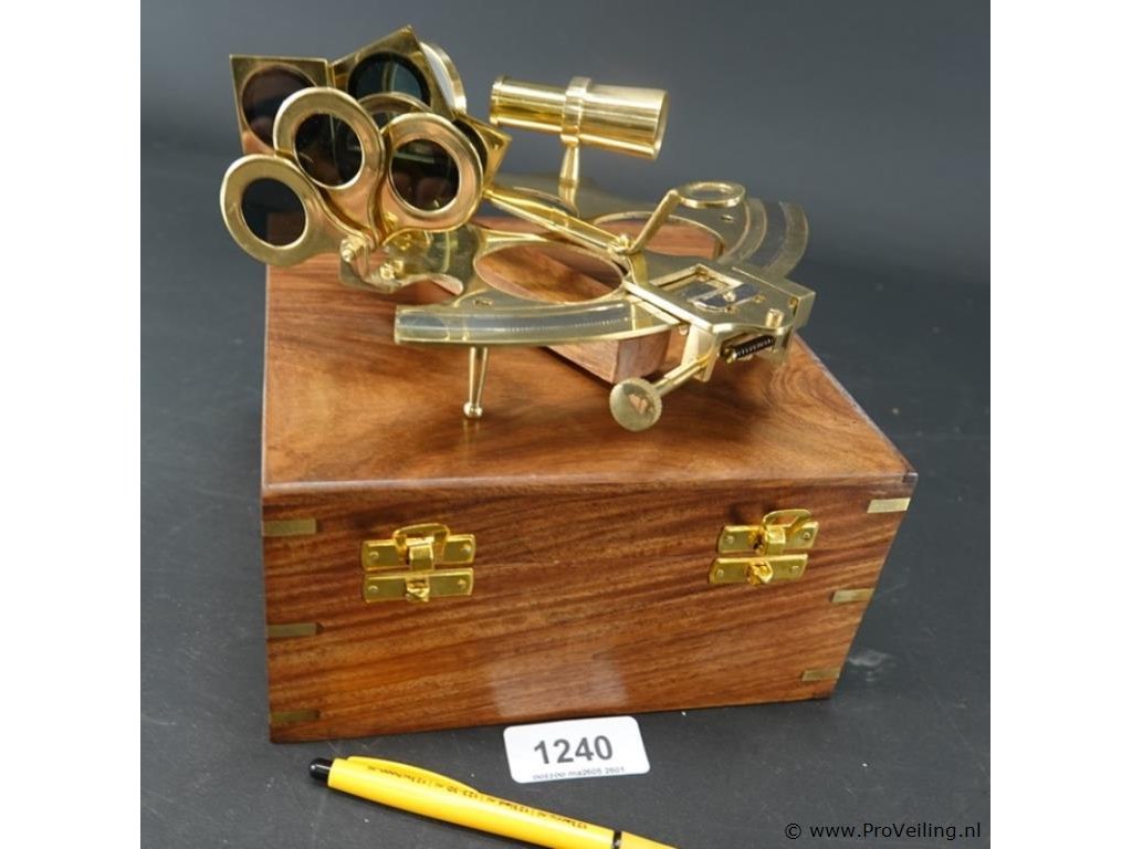 Messing sextant in met brons beslagen houten kist
