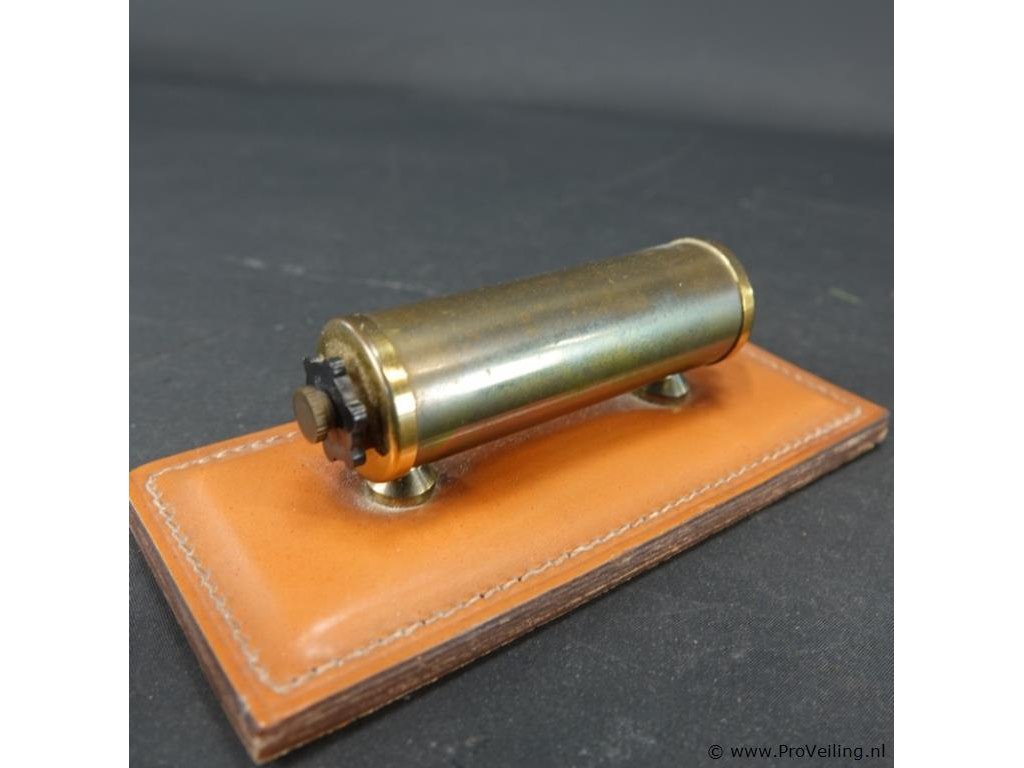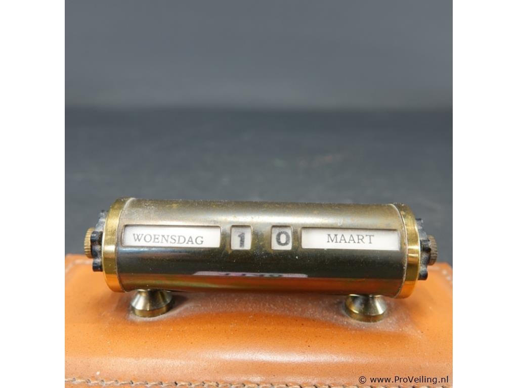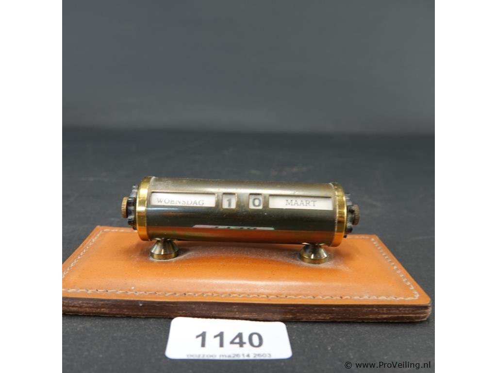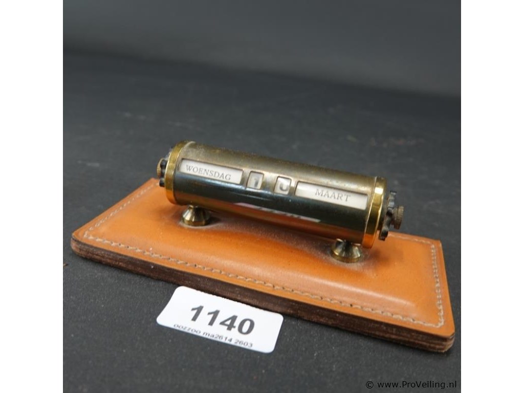Vintage eeuwigdurende kalender gemaakt van messing op een leren basis.