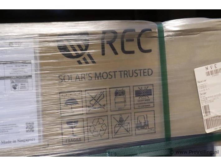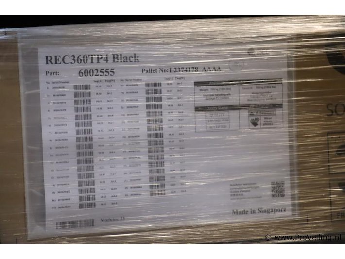 REC Zonnepaneel 360TP4 6002555; aantal 1 pallet á 33 stuks; Pmax: 360W; Impp: 10.62 A; Vmpp: 33.9V; gewicht ca. 705kg; nieuw in verpakking.