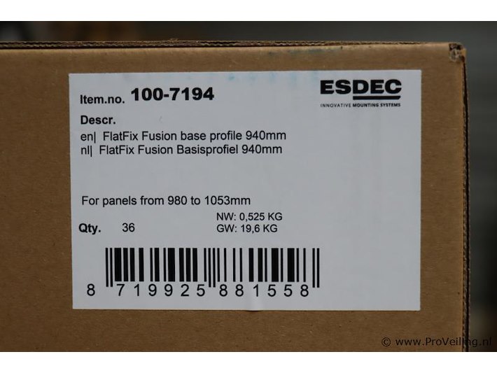 ESDEC FlatFix Fusion basisprofiel voor zonnepanelen 940mm 100-7194; aantal 4 dozen á 36 stuks; nieuw; winkelverkoopprijs ca. € 227,- per doos; zie afbeeldingen.