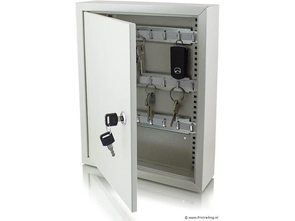 Beschrijving: De sleutelkluis is ideaal voor het opbergen van belangrijke sleutels. Kies tussen veilige wand- of kastmontage. De sleutelkluis wordt geopend met de meegeleverde veiligheidssleutel. Inrichting: Sleutelkluis voor wand- of kastmontage 6x flexibele rijen sleutels, elk met 7 haken Inclusief 2 beveiligingssleutels Technische specificaties: Afmetingen: 270 mm x 350 mm x 80 mm (B/H/D) Stalen wanddikte: 1 mm Stalen deurdikte: 2 mm Kleur: lichtgrijs Gewicht: 2,10 kg Leveringsomvang: 1x sleutelkluis met insteeksysteem 2x beveiligingssleutels 4x pluggen 4x schroeven 6x steeksleutelrijen