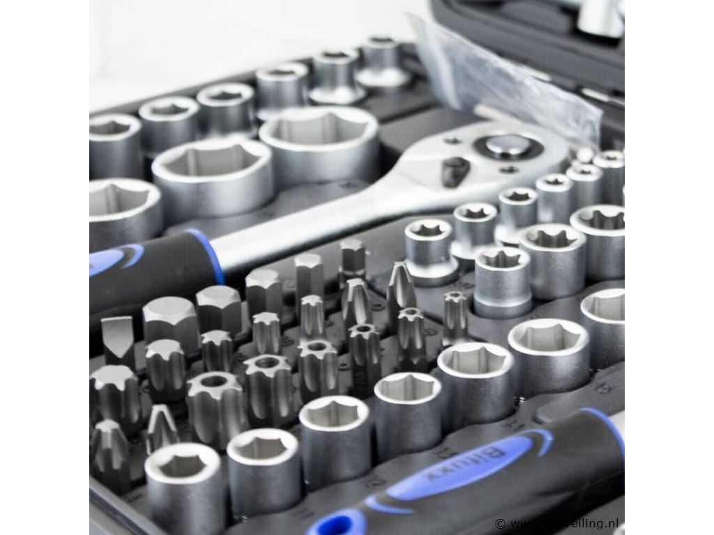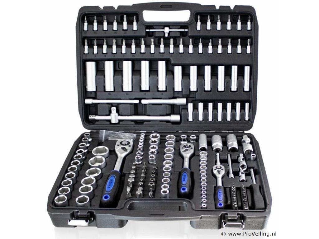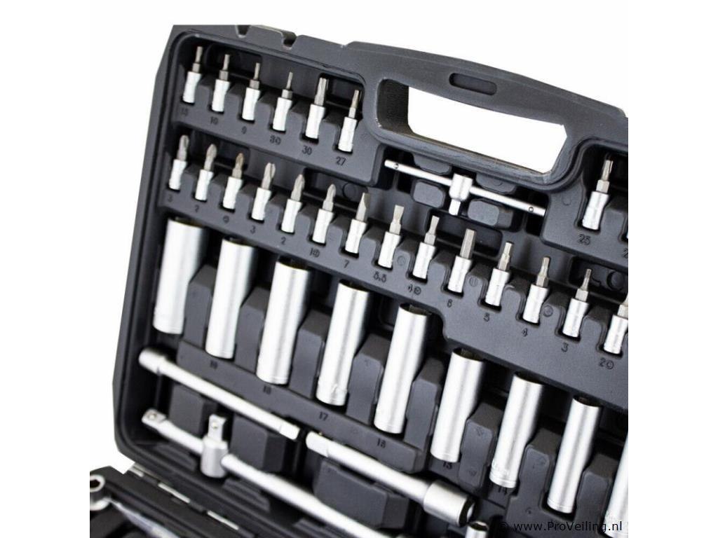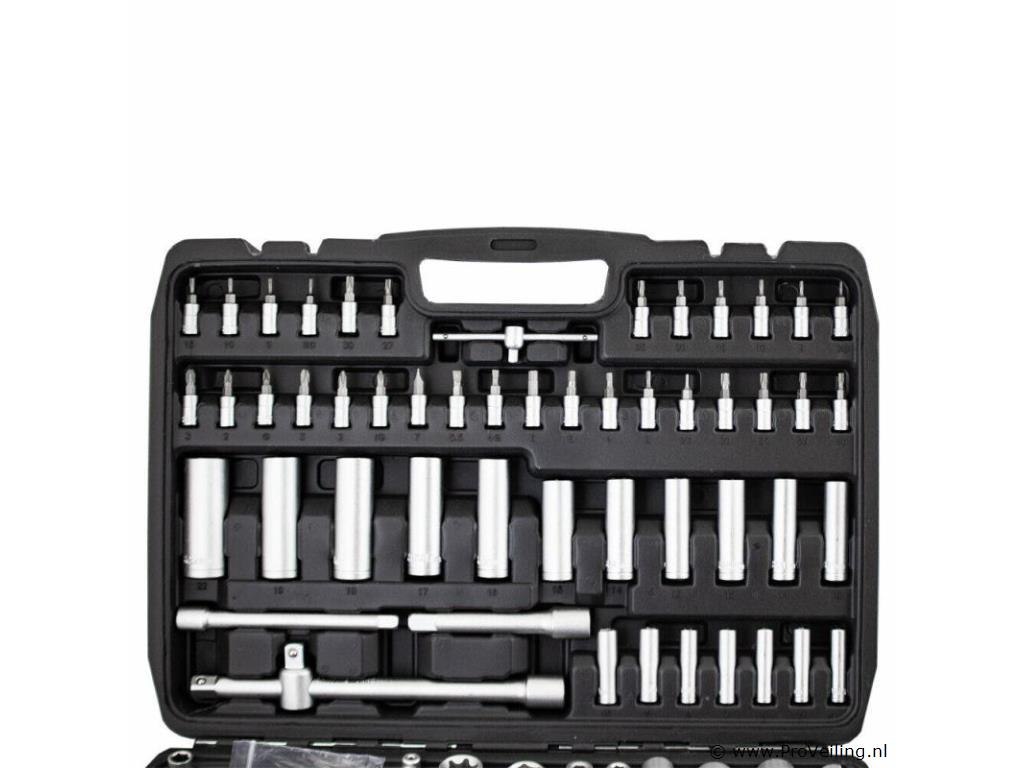 Deze 171-delige gereedschapskofferset met ratel overtuigt door kwaliteit en omvang. De ideale set voor de ambitieuze doe-het-zelver, praktisch en overzichtelijk, veilig opgeborgen in de koffer. Het gereedschap is gemaakt van chroom-vanadium-staal, het vanadium zorgt voor een verhoogde taaiheid met een fijnere structuur en het chroomgehalte verbetert de corrosiebescherming en hardbaarheid. Technische specificaties: Materiaal kast: kunststof Gewicht (N/G) ca. 9,2 kg Gereedschapsmateriaal: chroom-vanadiumstaal Leveringsomvang: 1/2" 17x 1/2" doppen: 10, 11, 12, 13, 14, 15, 16, 17, 18, 19, 20, 21, 22, 24, 27, 30, 32 mm 5x 1/2" extra diepe doppen: 16, 17, 18, 19, 22 mm 2x 1/2" Torx doppen: E20, E24 2x 1/2" bougiedoppen: 16 mm & 21 mm 2x 1/2" verlengstukken: 5" & 10" 1/4" 30x 1/4" bitdoppen: H2, 3, 4, 5, 6 FD4, 5. 5.5, 7 PH1, 2, 3 T8, 9, 10, 15, 20, 25, 27, 30, TT8, 9, 10 , 15, 20, 25, 27, 30 13x 1/4" doppen: 4, 4,5, 5, 5,5, 6, 7, 8, 9, 10, 11, 12, 13, 14 mm 7x 1/4" extra diepe doppen: 4, 5, 6, 7, 8, 9, 10 mm 5x 1/4" Torx doppen: E4, E5, E6, E7, E8 2x 1/4" verlengstukken: 2" & 4" 1x 1/4" T-greep 1x 1/4" steekgreep: 6" 3/8" 10x 3/8" doppen: 10, 11, 12, 13, 14, 15, 16, 17, 18, 19 mm 6x 3/8" Torx doppen: E10, E11, E12, E14, E16, E18 6x 3/8" extra diepe doppen: 10, 11, 12, 13, 14, 15 mm 1x 3/8" bougiedop: 21 mm 1x 3/8" verlengstuk: 6" ratels 3x ratel: 1/4", 3/8" & 1/2" 3x cardangewrichten: 1/4", 3/8" & 1/2" 2x aansluitingen (8 mm): 3/8" & 1/2" 1x driedubbele adapter Bits: 24x bits: H7, 8, 10, 12, 14 FD8, 10, 12 PH3, 4 PZ3, 4e T40 45, 50, 55, 60, 70 TT40, 45, 50, 55, 60, 70 10x bits: T3, 4, 5, 8, 9, 10, 15, 20, 25, 30 10x bits: TT4, 5.5, 7, 8, 9, 10, 15, 20, 25, 30 inbussleutel 7x inbussleutels: 1,5, 2, 2,5, 3, 4, 5, 6 mm Overig: 1x kunststof koffer