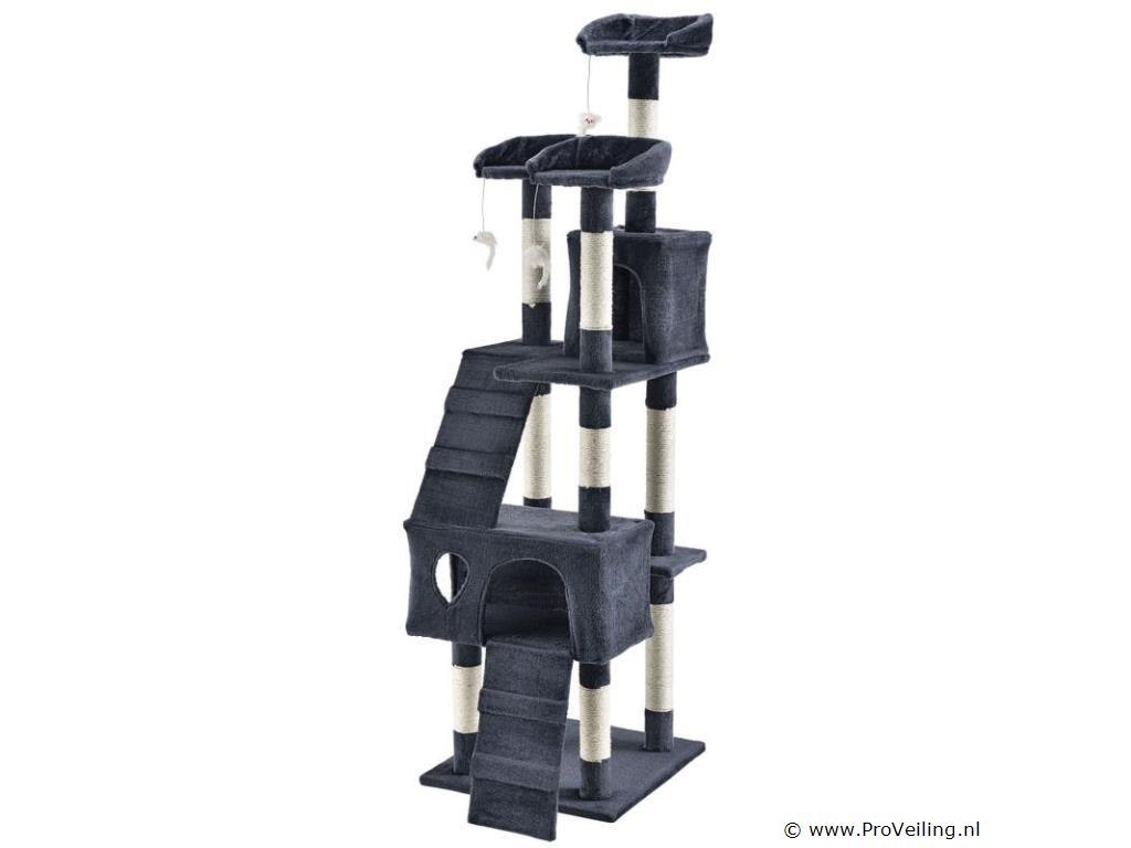 De halfhoge krabpaal Amy (grijs) laat kattenharten sneller kloppen. Het biedt uw geliefde huisdier tal van mogelijkheden om te spelen, rond te springen, te rusten en hun klauwen te scherpen. Uw kat zal zich helemaal op zijn gemak voelen en zich graag terugtrekken in de krabpaal. Door zijn compacte ontwerp neemt de 170 cm hoge krabpaal weinig ruimte in beslag en is zelfs in kleine appartementen te vinden. Dit maakt deze krabpaal tot een waardevolle investering voor iedere kattenbezitter. Technische specificaties: Materiaal: MDF hout, pluche, sisal Kleur grijs Diameter kolommen: 7 cm Aantal ligplaatsen: 3 Aantal grotten: 2 Aantal ladders: 2 Aantal muizen: 3 Afmetingen (ongeveer): Totale hoogte: 170 cm Bodemplaat: 49 x 49 cm Grot groot: 50 x 24 x 25 cm Grot klein: 24 x 24 x 27 cm Diameter ligvlak: 25 cm Leveringsomvang: 1 x krabpaal 1 x Instructie