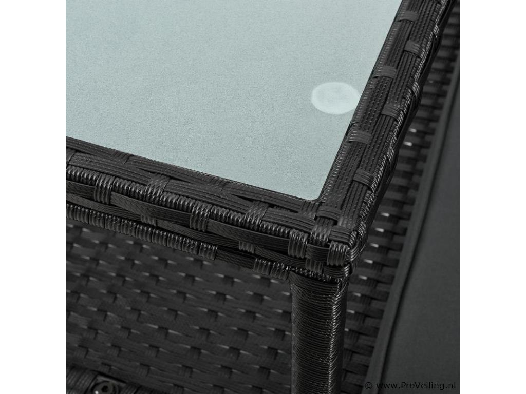 Bent u op zoek naar een stijlvolle zitgelegenheid voor uw balkon, tuin of terras die comfortabel en ruimtebesparend is? Kies dan voor de moderne polyrotan bank Monaco in zwart met donkergrijze zitkussens. De kleine tuinbank voor 2 personen neemt buiten maar weinig ruimte in beslag (133 × 63 × 84 cm) en is daarom ideaal als balkonmeubel. Ook bij de vijver, het zwembad of onder een boom oogt de 2-zitsbank in rotan-look modern en tijdloos. Het trendy vlechtwerk van polyrattan is onderhoudsvriendelijk en zorgt samen met het dikke zitkussen voor een zachte zitervaring. Zet drankjes of snacks op het kleine tafeltje in het midden. Technische specificaties: Materiaal gaas: polyrotan Materiaal frame: staal Materiaal tafelblad: glas Materiaal bekleding: schuim Materiaal hoezen: polyester Vlechtkleur: zwart Kleur kussensloop: donkergrijs Aantal zitplaatsen: 2 Hoezen wasbaar: ja Weerbestendig: ja Afmetingen (ongeveer): Totale afmetingen (BxDxH): 133 × 63 × 84 cm Zitkussen: 5 cm hoog Hoogte van de glasplaat: 0,5 cm Leveringsomvang: 1 x poly rotan bank 1 x geïntegreerde tafel 2 x zitkussens 1 x Instructie De poly rattan zitgroep wordt geleverd als bouwpakket voor zelfmontage per pakketdienst.