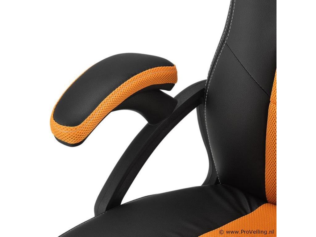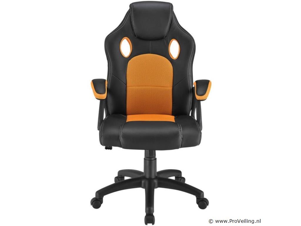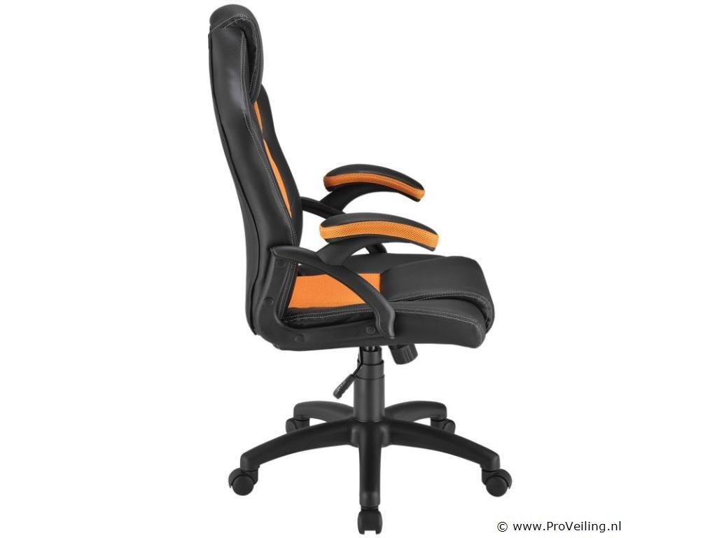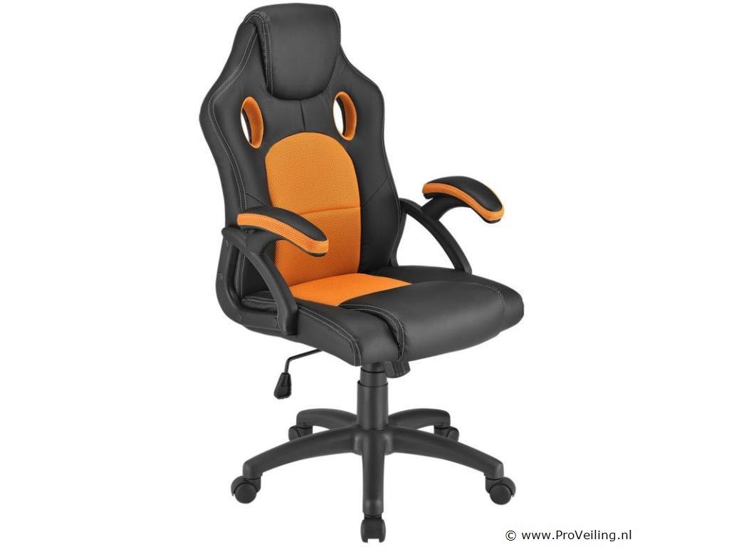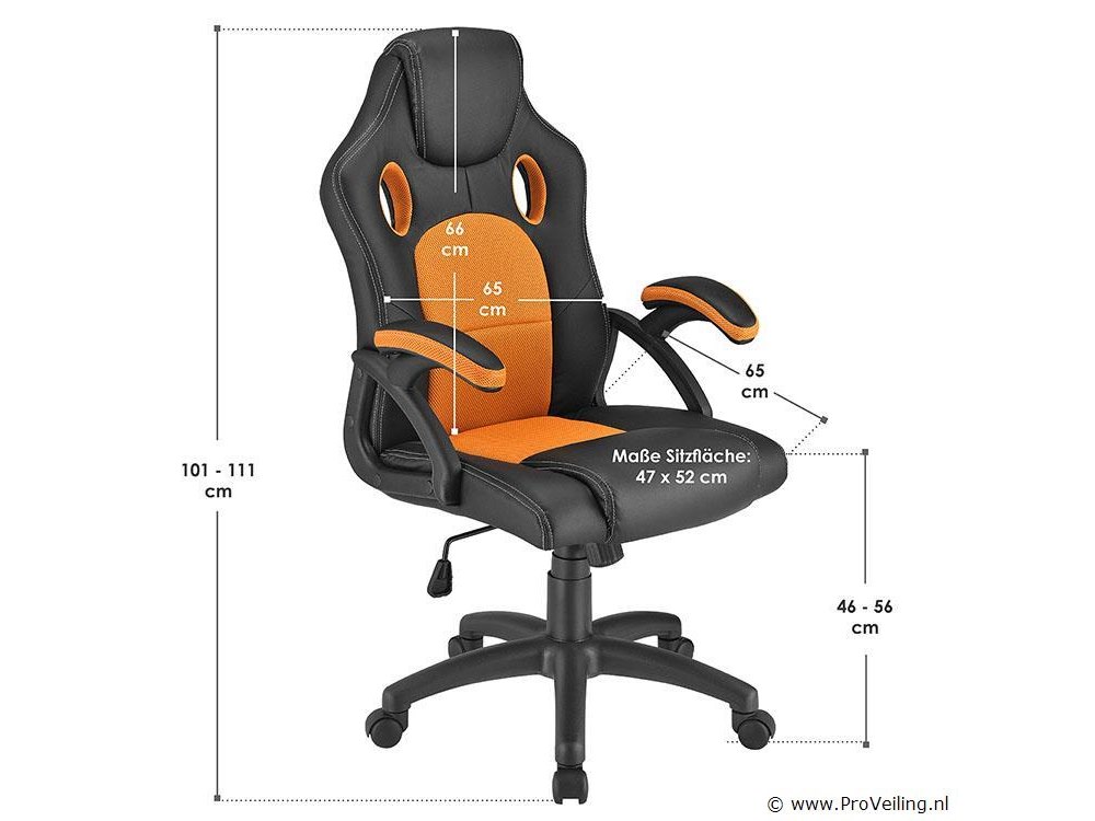 De knusse racebureaustoel Montreal (oranje) overtuigt met een hoog zitcomfort. Met zijn ergonomisch gevormde zitting, de kantelbare rugleuning en zitting en de gecapitonneerde armleuningen laat de moderne bureaustoel in trendy racer design urenlang comfortabel zitten. De draaistoel is daarom ideaal om thuis op kantoor te werken, huiswerk te maken en te leren, en voor gepassioneerde gamers om op de computer te spelen. Technische specificaties: Materiaal: kunststof, metaal, imitatieleer, mesh inzetstuk Kunstleer kleur: Zwart Netkleur: oranje Maximale belasting: 120 kg Afmetingen (ongeveer): Totale hoogte: 101 - 111 cm Hoogte rugleuning: 65 × 66 cm Zitting: 47 x 52 cm Zithoogte: 46 - 56 cm Zitbreedte: 47 cm Zitdiepte: 52 cm Leveringsomvang: 1 × bureaustoel 1 × montage-instructies