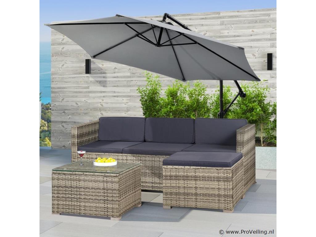 Ben je op zoek naar een comfortabele en grote loungeset voor in je tuin, terras of balkon? Met de zitgroep "Punta Cana M" verander je je buitenruimte in een stijlvolle plek om te ontspannen en je goed te voelen. Gezellige avonden met familie, vrienden of buren worden een geweldige belevenis in de buitenlucht. De unieke rotan-look in beigegrijs met grijze kussens geeft je nieuwe loungemeubel een moderne charme. Creëer je eigen oase van welzijn om te ontspannen en samen te zitten. Technische specificaties: Materiaal: Weefsel: vezels van polyrotan Frame: staal Tafelblad: glas Zitkussens: schuim Hoezen: 100% polyester Zithoogte: 37 cm Dikte zitkussen: 5 cm Dikte glasplaat: 0,5 cm Kleur: Vlecht: gemêleerd grijs Kussenslopen: donkergrijs Afmetingen (ongeveer): Bank: 178 × 69 × 65 cm (L x B x H) Tafel: 61 × 61 × 37 cm (L x B x H) Kruk: 61 × 61 × 37 cm (L x B x H) Dikte zitkussen: 5 cm Dikte glasplaat: 0,5 cm Breedte rugkussen: 54 cm Zitkruk: 60 × 60 cm Leveringsomvang: 1x tafel 1 x Bank 1 x kruk 4 x zitkussens 3 x rugkussens 1 x montagehandleiding