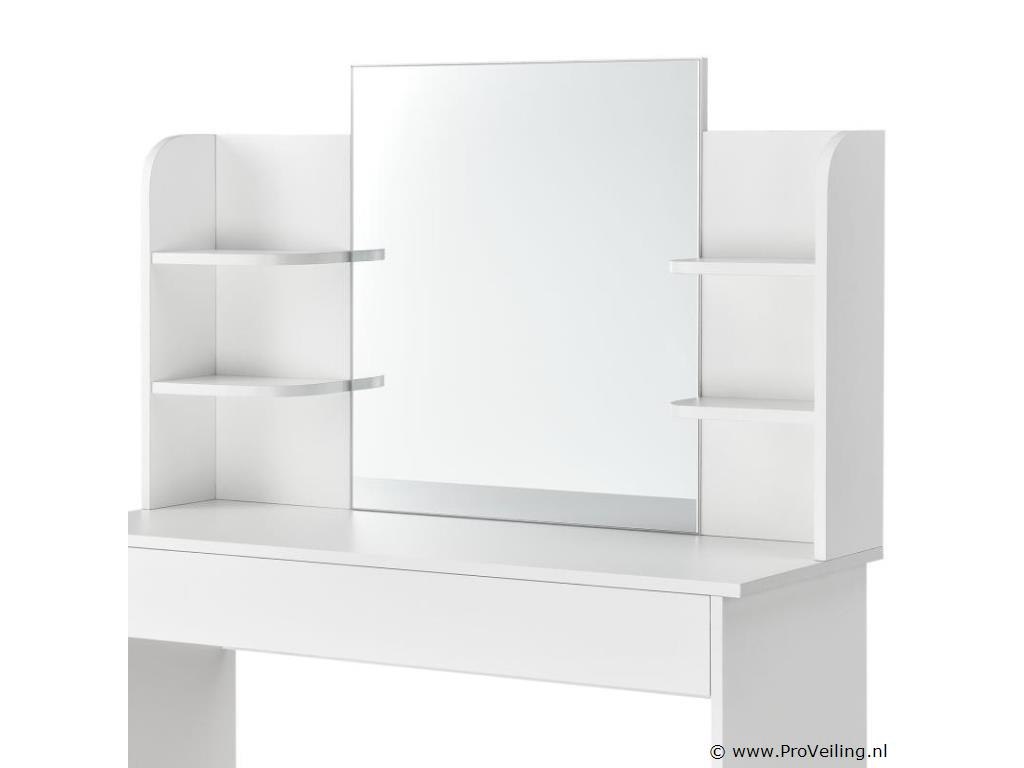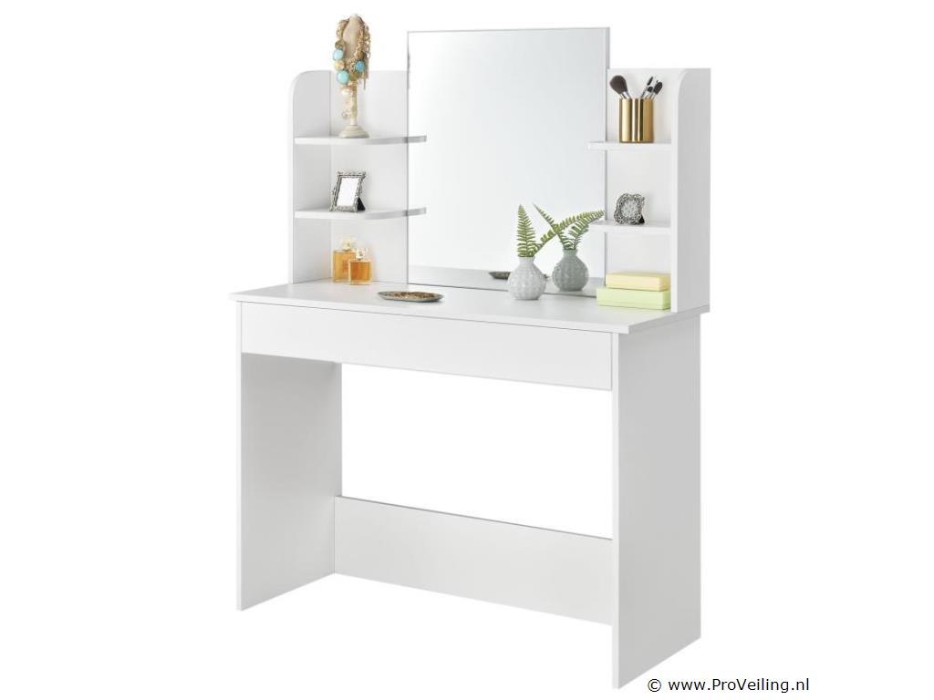 Ben je op zoek naar een moderne cosmeticatafel voor je dagelijkse styling? De prachtige Bella kaptafel met grote spiegel is daar de perfecte plek voor! Stijl jezelf hier comfortabel voor het dagelijks leven. Want in de ruime lade en in de 4 vakken berg je je cosmetica altijd bij de hand en netjes op. De make-uptafel met spiegel is ook visueel indrukwekkend. Dankzij het eenvoudige design met rechte lijnen fleurt hij elke kinderkamer en slaapkamer op. Zelfs jonge mensen zullen de moderne make-uptafel meteen leuk vinden! Bovendien is het product van gelakt MDF-hout extreem stabiel en onderhoudsvriendelijk. Technische specificaties: Materiaal ladekast: MDF houtvezelplaten Kleur kaptafel: Wit Aantal make-up spiegels: 1 Aantal lades: 1 Aantal opbergvakken: 4 Afmetingen (ongeveer): Dressoir: 108 × 40 × 140 cm (L x B x H) Spiegel: 65 × 57 cm (H x B) Lade: 99 × 30 cm (L x B) Vakken: elk 24 × 15 cm (L x B) Hoogte tafelblad: 75 cm Leveringsomvang: 1 x kaptafel met spiegel 1 x Instructie