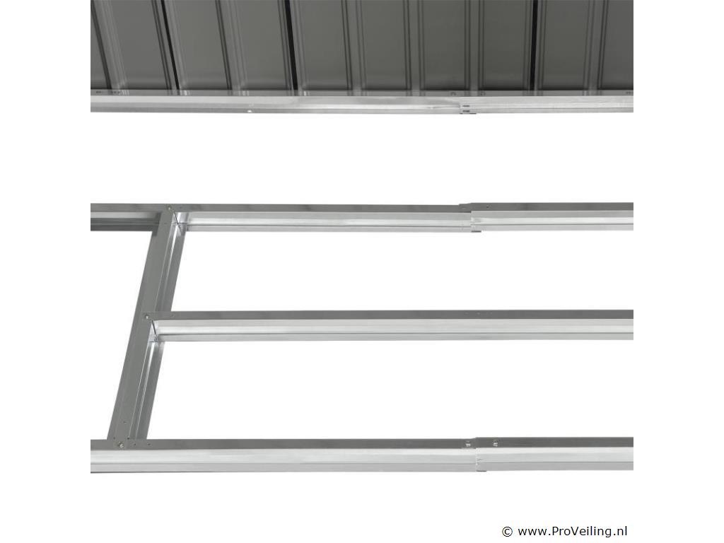 Creëer orde in je tuin - met de moderne XL metalen gereedschapsschuur met schuin dak. Maak een einde aan roestig tuingereedschap of lelijke geïmproviseerde hoezen. Tuinmeubelen, tuingereedschap en fietsen vinden een beschutte plek in de ruime gereedschapsschuur. Zo berg je je outdoor spullen droog, schoon en netjes op. Een onderstel van metaal en een praktische dubbele schuifdeur maken de uitrusting compleet. Nog een pluspunt: ventilatieroosters zorgen voor een goede luchtcirculatie. Technische specificaties: Materiaal tuinhuisje: plaatstaal, kunststof Materiaal fundering: metalen frame Kleur antraciet Bergruimte: ca. 9 m³ Afmetingen (ongeveer): Totale afmetingen: 277 × 191 × 192 cm Interne afmetingen: 267 × 181 × 187 cm Afmetingen voet: 267 × 181 cm Nokhoogte: 192 cm Hoogte dakrand: 152 cm Deur: 96 x 152 cm Leveringsomvang: 1 x metalen gereedschapsschuur 1 x funderingsframe 1 x montage-instructies Dit artikel bestaat uit 3 dozen, het kan logistiek voorkomen dat het in meerdere dagen geleverd wordt.