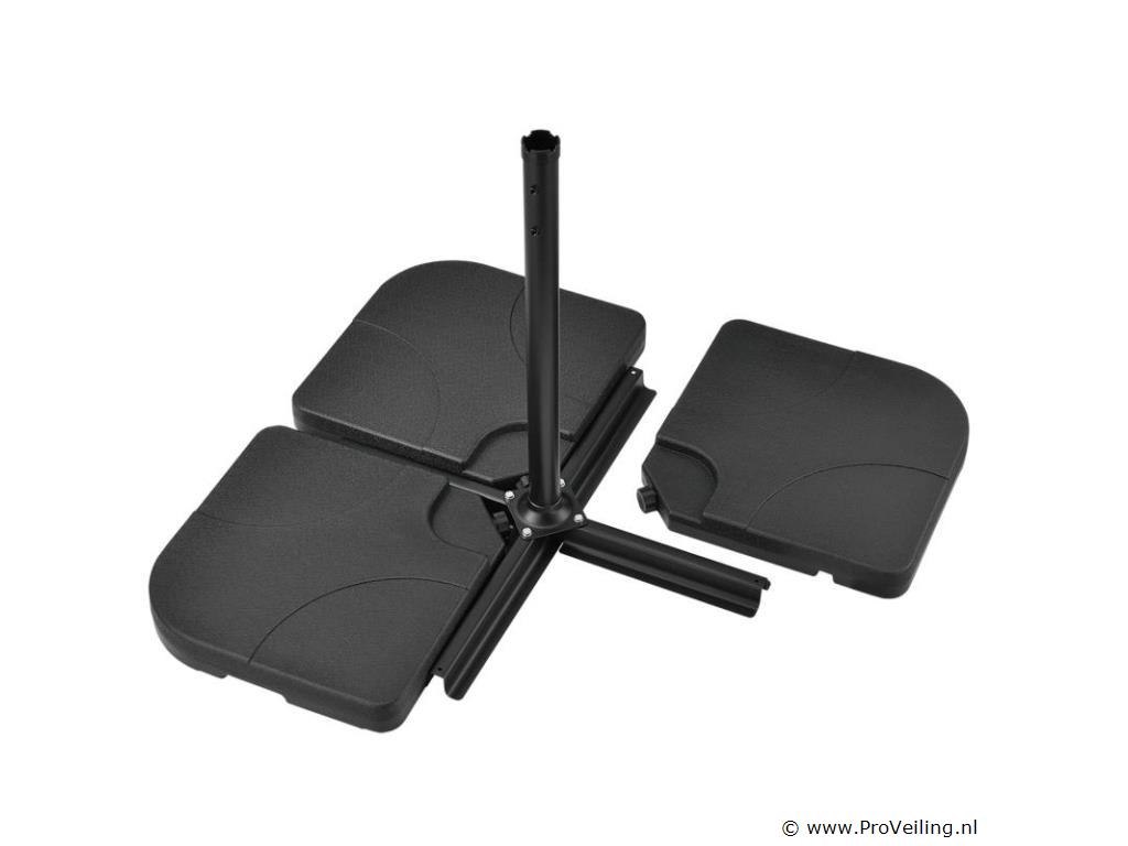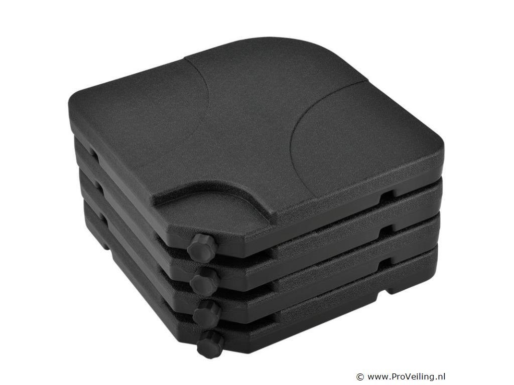 De praktische parasolgewichtset van 4 Quad (zwart) van kunststof is de perfecte aanvulling op parasolstandaarden met een kruisvoet. De met zand en water te vullen gewichten zorgen ervoor dat uw parasol / vrijdragende parasol niet per ongeluk omvalt. Uw rustgevende schaduwaanbieder staat stevig op de grond. Op het balkon of terras kun je het helemaal naar je zin hebben en in de schaduw genieten van het mooie weer. Technische specificaties: Materiaal: HDPE-kunststof De kleur zwart Aantal gewichten: 4 Kan worden gevuld met: water / zand Capaciteit per gewicht: 15 liter / 20 kg Totale inhoud: 60 liter / 80 kg Afmetingen (ongeveer): Totale afmetingen: 100 × 100 × 7,5 cm Afmeting per parasolgewicht: 50 × 50 × 7,5 cm Leveringsomvang: 4 × parasolgewicht 1 × Instructie