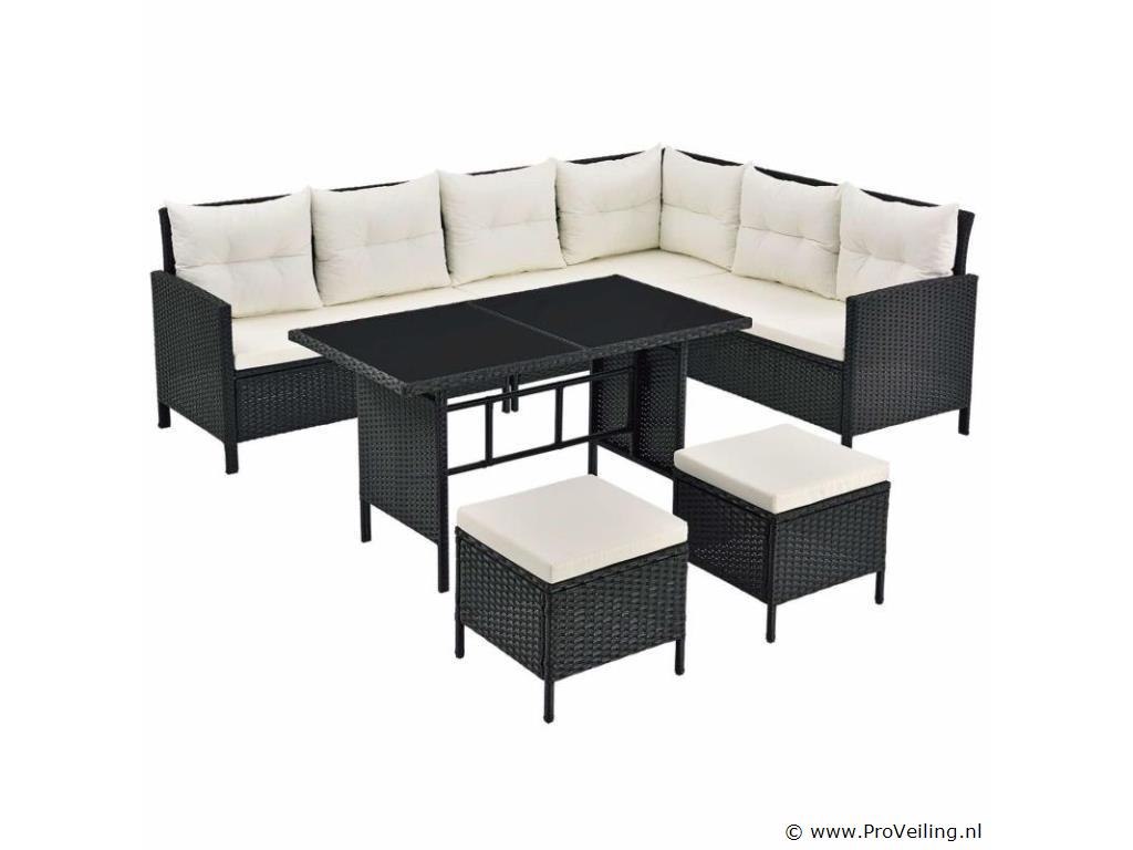 Met de Manacor polyrattan loungeset verander je je tuin, terras of balkon in een stijlvolle plek om te relaxen en je goed te voelen. De grote tuinlounge met een bank, 2 krukken en een tafel is geschikt voor maximaal 7 personen. Zachte zit- en rugkussens zorgen voor een comfortabele zitervaring. De grote eettafel is beschikbaar om te dineren of bordspellen. Gezellige avonden met familie, vrienden of buren worden een geweldige belevenis in de buitenlucht. De unieke rotan-look geeft de tuinmeubelset een moderne charme. Technische specificaties: Materiaal frame: staal, gepoedercoat Materiaal gaas: polyrotan Materiaal tafelblad: veiligheidsglas Materiaal zitkussen: 100% schuim Materiaal hoezen: 100% polyester Vlechtkleur: zwart Kleur hoes: creme Dikte glasplaat: 5 mm Aantal zitkussens: 5 Aantal rugkussens: 7 Dikte kussen: 5 cm Omslagen: 220g/m2 Afmetingen (ongeveer): Bankelement links: 110 x 62 x 80 cm Rechter bankelement: 110 x 62 x 80 cm Centraal bankelement: 118 x 62 x 80 cm Kruk: 40 x 40 x 35 cm Tafel: 116 x 66 x 66 cm Let op: De hoezen van de zitkussens kunnen eraf geritst en gewassen worden. De hoezen van de rugkussens zijn echter niet afneembaar (hoes aan het kussen genaaid) en dus niet wasbaar. Ze hebben een ritssluiting, maar die heeft geen functie. Alleen de hoezen van het zitkussen zijn wasbaar. Ververs de impregnering na het wassen. Het hele kussen mag niet in de wasmachine, anders zal de vulling eronder lijden. Leveringsomvang: 1 × hoekbank 2 × krukken 1 × tafel 2 × glasplaten 5 × zitkussens 7 × rugkussens 1 × Instructie