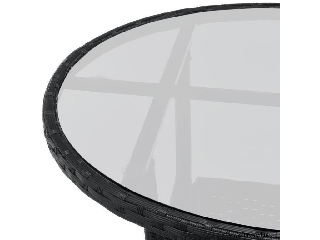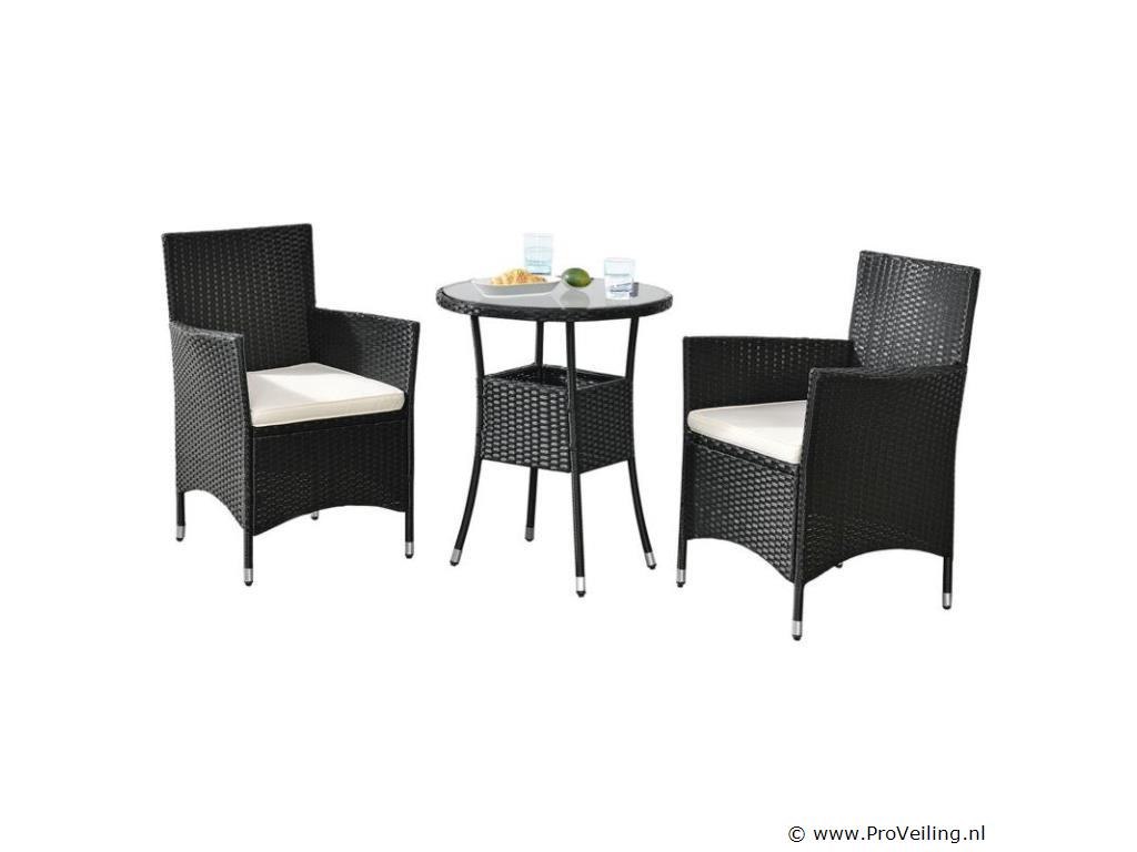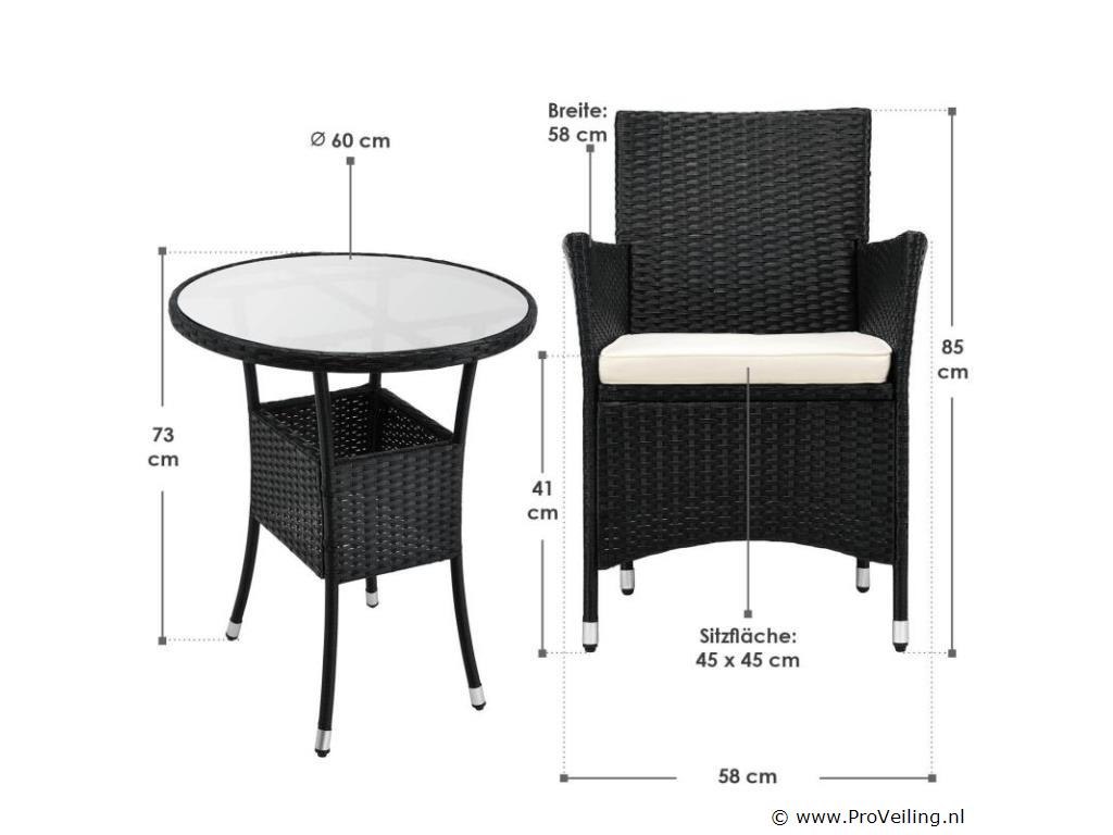 Technische specificaties: Materiaal stoel: polyrotan & metaal Materiaal tafel: polyrotan, metaal & glas Materiaal pads: polyester & schuim Wasbare hoezen: ja Weerbestendig: ja Kleur meubel: zwart Kleur zitkussens: crème Maximaal gewicht: 160 kg Afmetingen (ongeveer): Afmetingen stoel: 58 x 58 x 85 cm (lengte x breedte x hoogte) Stoelzitting: 45 x 45 cm Zithoogte: 41 cm Hoogte tafel: 73 cm Diameter tafel: 60 cm