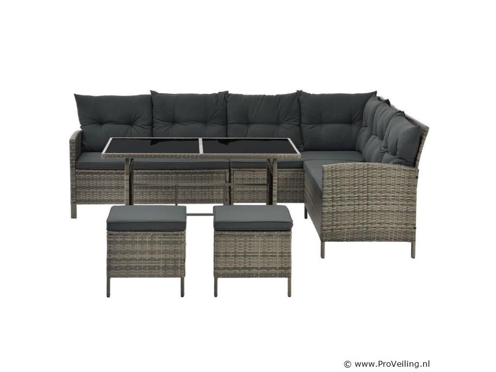Met de Manacor polyrattan loungeset verander je je tuin, terras of balkon in een stijlvolle plek om te relaxen en je goed te voelen. De grote tuinlounge met een bank, 2 krukken en een tafel is geschikt voor maximaal 7 personen. Zachte zit- en rugkussens zorgen voor een comfortabele zitervaring. De grote eettafel is beschikbaar om te dineren of bordspellen. Gezellige avonden met familie, vrienden of buren worden een geweldige belevenis in de buitenlucht. De unieke rotan-look geeft de tuinmeubelset een moderne charme. Technische specificaties: Materiaal frame: staal, gepoedercoat Materiaal gaas: polyrotan Materiaal tafelblad: veiligheidsglas Materiaal zitkussen: 100% schuim Materiaal hoezen: 100% polyester Vlechtkleur: grijs gemêleerd Kleur hoezen: donkergrijs Dikte glasplaten: 5 mm Aantal zitkussens: 5 Aantal rugkussens: 7 Dikte kussen: 5 cm Omslagen: 180g/m2 Afmetingen (ongeveer): Bankelement links: 105 x 62 x 80 cm Rechter bankelement: 105 x 62 x 80 cm Centraal bankelement: 115 x 62 x 80 cm Kruk: 40 x 40 x 40 cm Zithoogte kruk & bank: 40 cm Tafel: 116 x 66 x 65 cm Een mededeling: De hoezen van de zitkussens kunnen eraf geritst en gewassen worden. De hoezen van de rugkussens zijn echter niet afneembaar (hoes aan het kussen genaaid) en dus niet wasbaar. Ze hebben een ritssluiting, maar die heeft geen functie. Alleen de hoezen van het zitkussen zijn wasbaar. Ververs de impregnering na het wassen. Het hele kussen mag niet in de wasmachine, anders zal de vulling eronder lijden. Leveringsomvang: 1 × hoekbank 2 × krukken 1 × tafel 2 × glasplaten 5 × zitkussens 7 × rugkussens 1 × Instructie