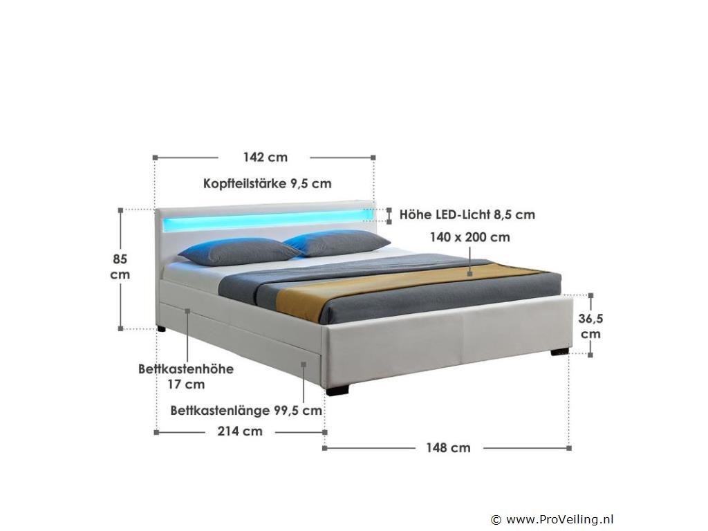 Met het gestoffeerde bed Lyon (140x200 cm, wit) haal je de allrounder in huis! Het opbergbed is een wonder van ruimte en maakt indruk met moderne apparatuur. Als eenpersoons-, jeugd- of logeerbed past hij ook in kleine slaapkamers. Op de stabiele lattenbodem kunt u uw matras van 140x200 cm optimaal plaatsen en gezond en comfortabel slapen. Het hoge hoofdbord heeft ook veel voordelen. Enerzijds dient het als een comfortabele rugleuning. Aan de andere kant verlicht hij dankzij de ledstrip de ruimte met prachtig indirect licht. Technische specificaties: Producttype: bedframe Kleur wit Stijl: modern Materiaal frame: MDF hout, metaal Materiaal bekleding: kunstleer (84% PVC, 16% polyester) Bedkasten: 4 Verlichting: LED-strip met afstandsbediening Lichtkleur: 16 verschillende kleuren Vermogen lichtbron: 11,3 W Lichtstroom: 263 lm Kleurtemperatuur: 3000-8000K Afmetingen (ongeveer): Afmetingen: 148 x 214 cm Ligoppervlak: 140 × 200 cm Hoogte hoofdbord: 85 cm Dikte hoofdeinde: 9,5 cm Hoogte bedframe: 36,5 cm Opmerkingen over de lichtbron: Het product bevat LED-verlichting. De meegeleverde LED-verlichting is alleen bedoeld voor scène-/accentverlichting en is niet geschikt voor andere toepassingen. De meegeleverde lampen zijn niet uitwisselbaar, maar uitneembaar. De meegeleverde LED-verlichting is via een IR-afstandsbediening in te stellen en te dimmen. De meegeleverde LED-verlichting moet worden afgevoerd in overeenstemming met de richtlijn afgedankte elektrische en elektronische apparatuur Leveringsomvang: 1 x gestoffeerd bed 1 x lattenbodem 1 x afstandsbediening 1 x Instructie Let op: Het matras is niet bij de levering inbegrepen. U ontvangt het product goed verpakt als bouwpakket voor zelfmontage per pakketdienst. Dit artikel bestaat uit 3 dozen, het kan logistiek voorkomen dat het in meerdere dagen geleverd wordt. Onderdelen kunnen zich in het hoofdbord bevinden.
