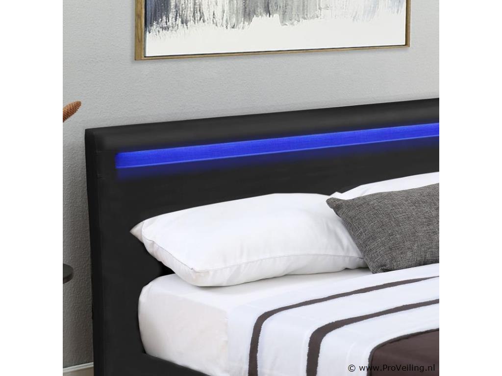Het knusse gestoffeerde bed Verona (zwart) met LED-verlichting en lattenbodem is de ideale plek om te ontspannen voor een goede en gezonde nachtrust. Met een ligvlak van 120 × 200 cm biedt het comfortabele eenpersoonsbed zowel tieners als alleenstaande volwassenen een extreem ruim aanbod. De eenvoudige hoes geeft het kunstleren bed een moderne uitstraling die naadloos in menig logeerkamer of slaapkamer past. Het charmante meubelstuk is ideaal om uit te rusten en nieuwe energie op te doen. Technische specificaties: Materiaal frame: MDF hout, metaal Materiaal bekleding: kunstleer (84% PVC, 16% polyester) Producttype: bedframe De kleur zwart Stijl: modern Verlichting: LED-strip met afstandsbediening Lichtkleur: 16 verschillende kleuren Vermogen: 12,1 W Lichtstroom: 198 lm Kleurtemperatuur: 2000 - 10000K Afmetingen (ongeveer): Afmetingen: 125 x 213 cm Ligoppervlak: 120 × 200 cm Hoogte hoofdeinde: 78 cm Dikte hoofdbord: 7 cm Framedikte voetdeel: 6 cm Framedikte zijkanten: 2,5 cm Lighoogte: 23,5 cm Voeten: 8 cm Opmerkingen over de lichtbron: Het product bevat LED-verlichting. De meegeleverde LED-verlichting is alleen bedoeld voor scène-/accentverlichting en is niet geschikt voor andere toepassingen. De meegeleverde lampen zijn niet uitwisselbaar, maar uitneembaar. De meegeleverde LED-verlichting is via een IR-afstandsbediening in te stellen en te dimmen. De meegeleverde LED-verlichting moet worden afgevoerd in overeenstemming met de richtlijn afgedankte elektrische en elektronische apparatuur. Leveringsomvang: 1 x gestoffeerd bed 1 x lattenbodem 1 x trafo & afstandsbediening 1 x voedingsadapter 1 x montagehandleiding
