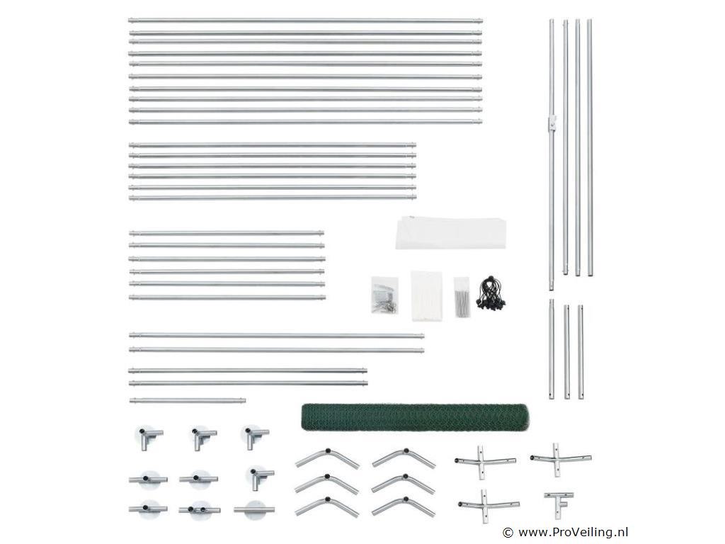 Ben je zelfvoorzienend of heb je een uitlaatklep nodig voor de trend “houd de kippen in de tuin”? Het buitenverblijf HLS25T van 3x4x2 m is perfect voor het soortspecifiek buiten houden van dieren. In de gegalvaniseerde box voor kippen, konijnen en ganzen hebben kleine dieren buiten genoeg ruimte op 12 m². Planten zijn hier ook beschermd en droog. Je bevestigt het waterdichte zeildoek flexibel aan het frame. Door de gegalvaniseerde buizen en het PVC-gecoate hek heb je een stabiel en duurzaam kippenhok dat je eenvoudig in elkaar zet door middel van het plug-and-click systeem. Technische specificaties: Materiaal draad: galvanisch verzinkt ijzer, PVC gecoat, zeshoekig (vorm) Materiaal palen: gegalvaniseerd ijzer Materiaal dekzeil: PE (waterdicht, regenbescherming), materiaal accessoires: kunststof Boxkleur: zilver, grijs (frame), wit (zeildoek), groen (net) Geschikt voor: kleine dieren zoals kippen, konijnen, ganzen, eenden & planten (bijv. gewassen, bloemen) Bijzonderheden: Toegankelijk via hoge deur, met poortgrendel, zeildoek Boxvorm: Vierkant Plaats van gebruik: buiten Afmetingen (ongeveer): Totale afmetingen van de volière: 300 x 400 x 200 cm (BxLxH), 385 cm (exacte lengte) Buitenruimte: 12 m² Hoogte dak: 115 - 200 cm Deur: 55 x 158 cm (BxH) Buisdiameter: 2,5 cm, dikte: 1 mm Rasterhek: 3 x 4 cm (BxH), dikte: 0,5 mm Dekzeil: 340 x 195 cm (BxH) Rol kippennet: 1 x 36m Leveringsomvang: 1 x Ren 1 x rol kippenhek 1 x dakzeil 1 x deur met vergrendeling 1 x Instructie Let op: Alleen geschikt voor kleine dieren zoals kippen, konijnen, ganzen, eenden & planten. Vraag: Kan ik meerdere producten aan elkaar koppelen? Nee. Kan de deur rechts of links worden geopend? We raden aan om ze links te monteren, rechts kan ook. De box is afsluitbaar met een grendel. Er is geen slot met sleutel, het wordt met de hand geopend en gesloten. Het PE dekzeil (waterdicht) heeft geen zonwerende functie, maar dient als regenwering. Je bevestigt het dekzeil flexibel aan de palen door middel van de elastische banden.