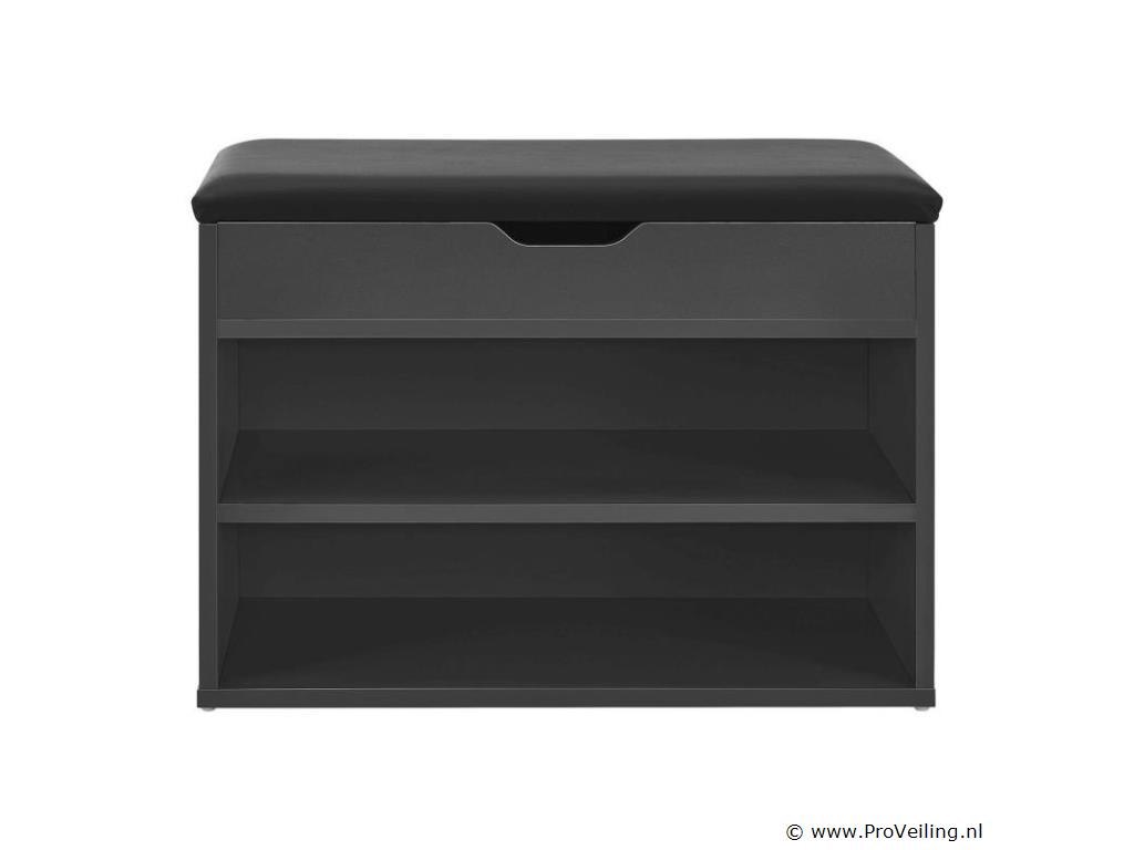 Het kleine schoenenrek blijkt een echt wonder van opbergruimte te zijn. De twee schoenenrekken bieden gemakkelijk plaats aan maximaal 6 paar schoenen. Bovendien is er een ruim vak verborgen onder het gevoerde deksel, waarin kleine voorwerpen zoals schoenlepels of schoenborstels een nieuw, onopvallend thuis vinden - binnen handbereik en netjes opgeborgen. De zachte bekleding doet tevens dienst als comfortabele zitplaats. Met een draagvermogen tot 150 kg zit je hier comfortabel om je schoenen aan en uit te trekken, schoon te maken en dergelijke. De plank is gemaakt van lichte en robuuste houten panelen met een slijtvaste melamine coating. Technische specificaties: Lichaamsmateriaal: spaanplaat E1 (melaminecoating) Materiaal achterwand: MDF-plaat Materiaal zitkussen: schuim, kunstleer (polyurethaan) Carrosseriekleur: grijs Kleur bekleding: zwart Maximaal draagvermogen: 150 kg Afwerking: Mat Afmetingen (ongeveer): Totale afmetingen (LxBxH): 60x30x44 cm Afmeting 1 vak: 57x27x8 cm Afmeting 2 vakken: 57x27x14 cm Paddikte: 4 cm Materiaaldikte: 15 mm Dikte achterwand: 3 mm Leveringsomvang: 1 × schoenenrek 1 × montage-instructies
