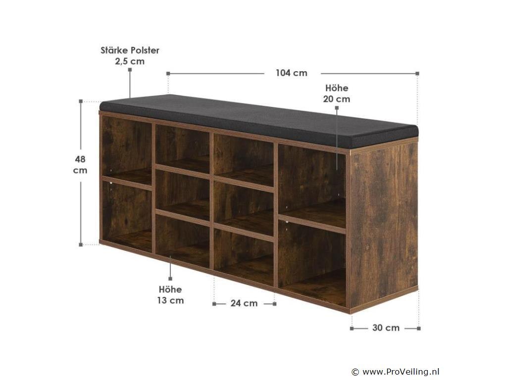 Het grote houten schoenenrek combineert praktische opbergruimte met comfortabel zitten. Of het nu in de gang, de keuken of in het woongedeelte is, de 10 vakken van verschillende grootte bieden voldoende ruimte voor gewone schoenen, hoge hakken en wandelschoenen. Als alternatief kan de kast ook worden gebruikt als voorraadkast of voor het opbergen van speelgoed, boeken of verzamelobjecten. De comfortabele en afneembare bekleding verandert de plank in een gezellige bank om te vertoeven of om je schoenen aan en uit te trekken. Zonder zitkussen dient de bank als lowboard voor de tv of kan met wat decoratie mooi worden geënsceneerd. Technische specificaties: Materiaal plank: spaanplaat E1 (melamine gecoat) Materiaal bekleding: stof Kleur plank: antiek bruin Kleur bekleding: zwart Maximaal draagvermogen: 150 kg Afmetingen (ongeveer): Totale afmetingen (LxBxH): 104 x 30 x 48 cm Brede vakken: 24 cm Diepe vakken: 30 cm Hoogte vakken: 6 x 13 cm | 4*20cm Houtdikte: 1,5 cm Paddikte 2,5 cm Leveringsomvang: 1 × schoenenrek 1 × kussen 1 × montage-instructies