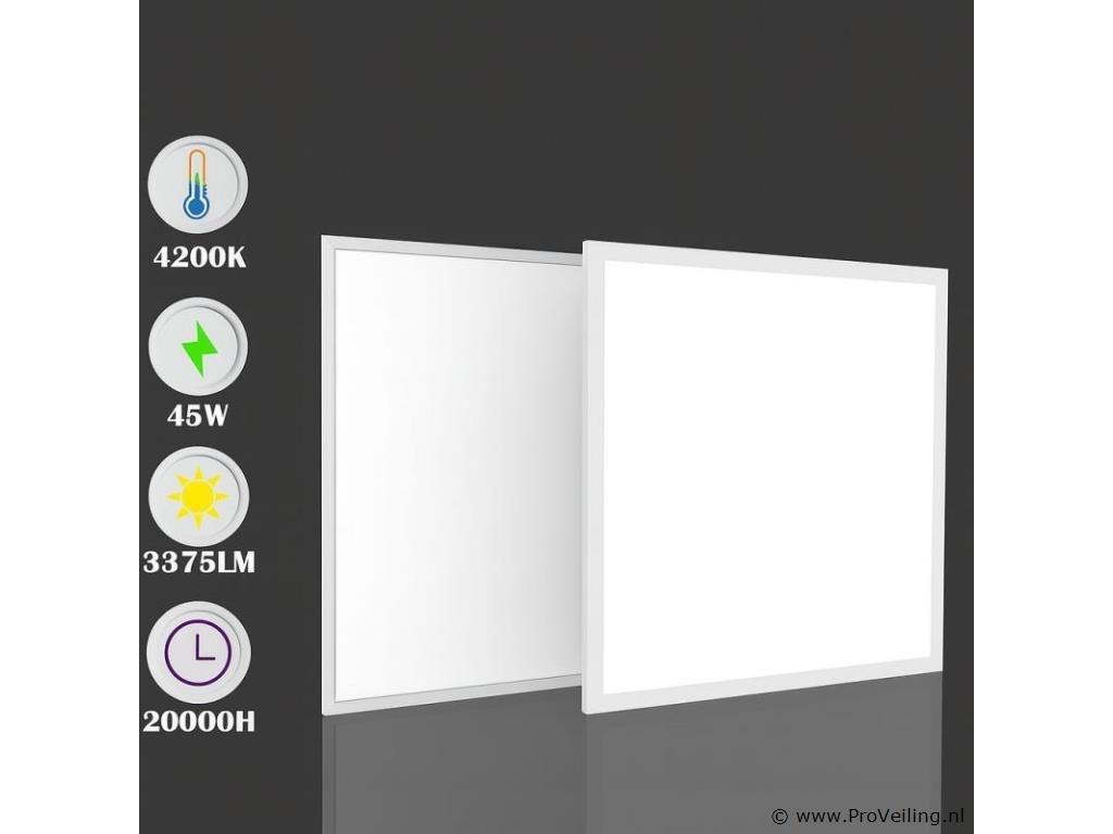 8 x LED-paneel 45W – 60 × 60 cm – 4200K – Super ECO – Wattage: 45W, Lichtopbrengst: 3375 lm, Kleurtemperatuur: 4200K (Neutraal wit), Spanning: 175–265 V AC / 50–60 Hz, LED-type: SMD LED, Kleur: Wit, Beschermingsgraad: IP20 (droge binnenruimtes), Lichtspreidingshoek: 120°, Afmetingen: 595 × 595 × 35 mm, Detail: Backlight paneel, Levensduur: ± 20.000 uur – IRC: 80 Ra – LED-type:SMD – Beamhoek: 120° – Inclusief transformator – Efficiënte en gelijkmatige lichtverdeling – Super ECO, energiezuinig en milieuvriendelijk ontwerp – Geschikt voor gebruik binnenshuis.