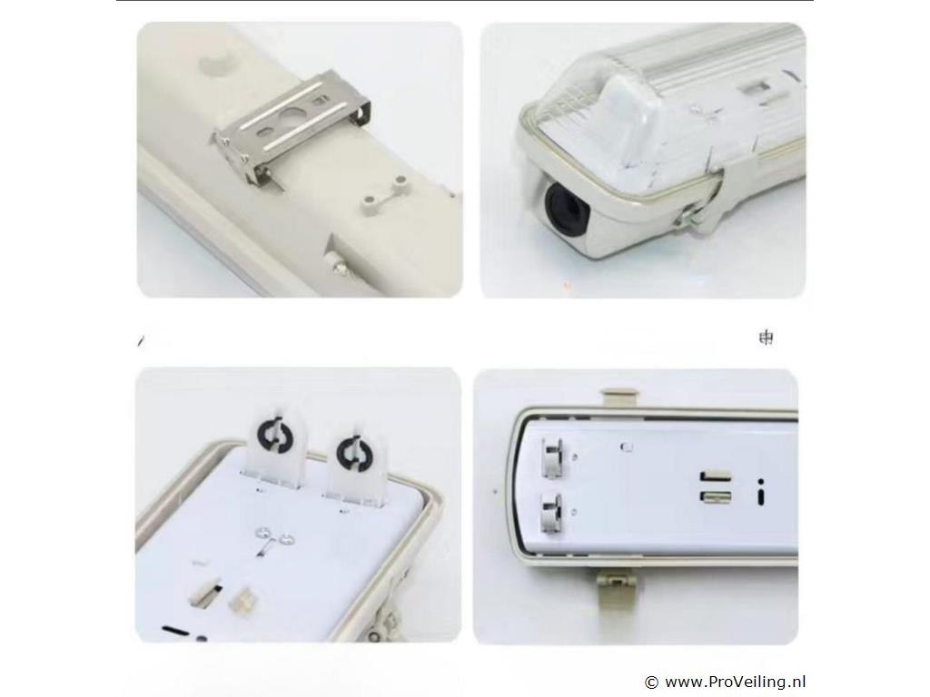 24 x Dual TL armatuur 120cm – IP65 Waterdicht – Dubbel frame voor fluorescen buizenTs – Lengte: 120 cm – Compatibel met standaard TL-buizen (niet inbegrepen) – Beschermingsgraad: IP65 (waterdicht, volledig beschermd tegen stof en waterstralen) – Geschikt voor gebruik binnen en buiten – Afmetingen: 1276 x 86 x 55 mm – Wordt geleverd met montageset voor eenvoudige installatie – Ideaal voor omgevingen waar betrouwbare verlichting vereist is.