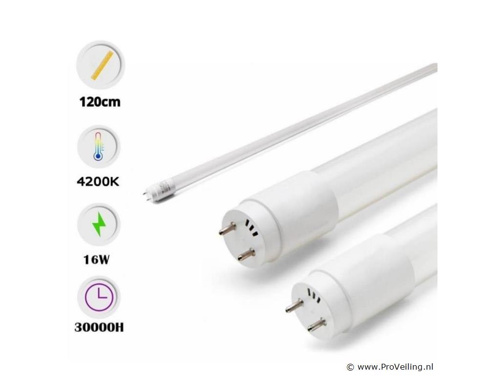 30 x LED-buizen 16W – 120cm – 4200K – T8 – LED-buis type T8 – Vermogen: 16W – Kleurtemperatuur: 4 200K (neutraal wit) – Krachtige, gelijkmatige en comfortabele verlichting – Lengte: 120 cm – Afmetingen: Ø 29 x 1214 mm – Beamhoek: 300° – Compatibel met standaard fluorescentielampen voor eenvoudige vervanging – Spanning: 165-265V (50/60Hz) – Levensduur: 25.000 uur – Geschikt voor gebruik binnenshuis – Eenvoudige, voordelige en betrouwbare oplossing.