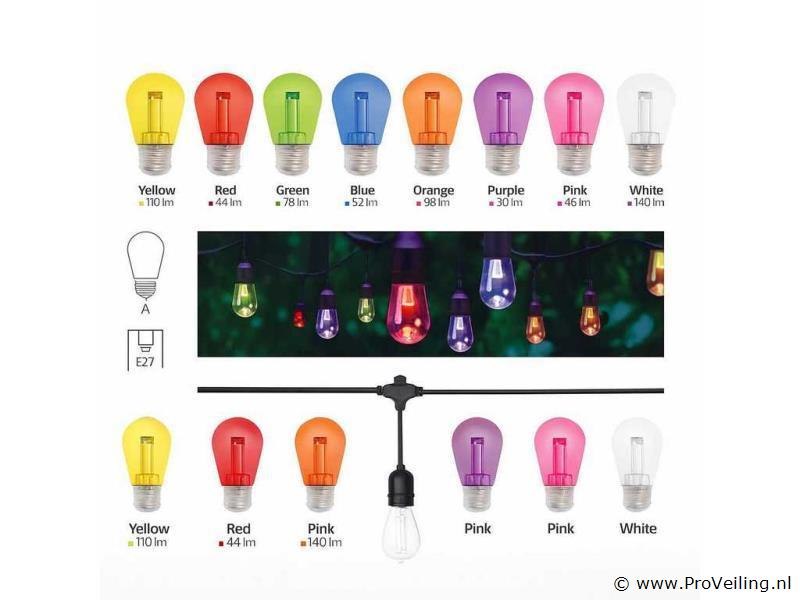 200 x ST45 shockproof LED-lampen in 8 verschillende kleuren, elk met een eigen lichtopbrengst. De lampen zijn vervaardigd uit slagvast kunststof (plastic) en hebben een 360° stralingshoek, ideaal voor feest-, decoratieve en sfeerverlichting. De lampen hebben een afmeting van Ø46 × 91 mm en zijn duurzaam en geschikt voor intensief gebruik. Ze zijn voorzien van een E27-fitting en werken op 220–240V, waardoor ze compatibel zijn met standaard prikkabels. Prikkabel niet inbegrepen.