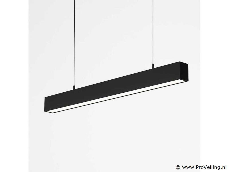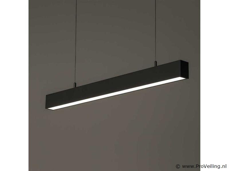 8 x Zwarte binnenlamp van aluminium en PC meet 1200 × 75 × 50 mm en geeft 4.200 lumen met een 120° stralingshoek. De lichtkleur is schakelbaar tussen 3000K, 4000K en 6500K. Geschikt voor binnengebruik (IP20) en in hoogte verstelbaar via de meegeleverde staaldraadophanging. Werkt op 170–265V (50/60Hz) en heeft een levensduur van 70.000 uur.