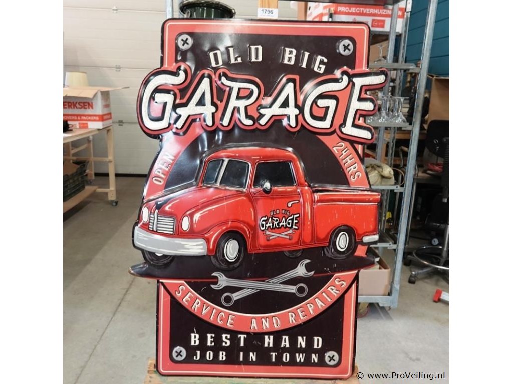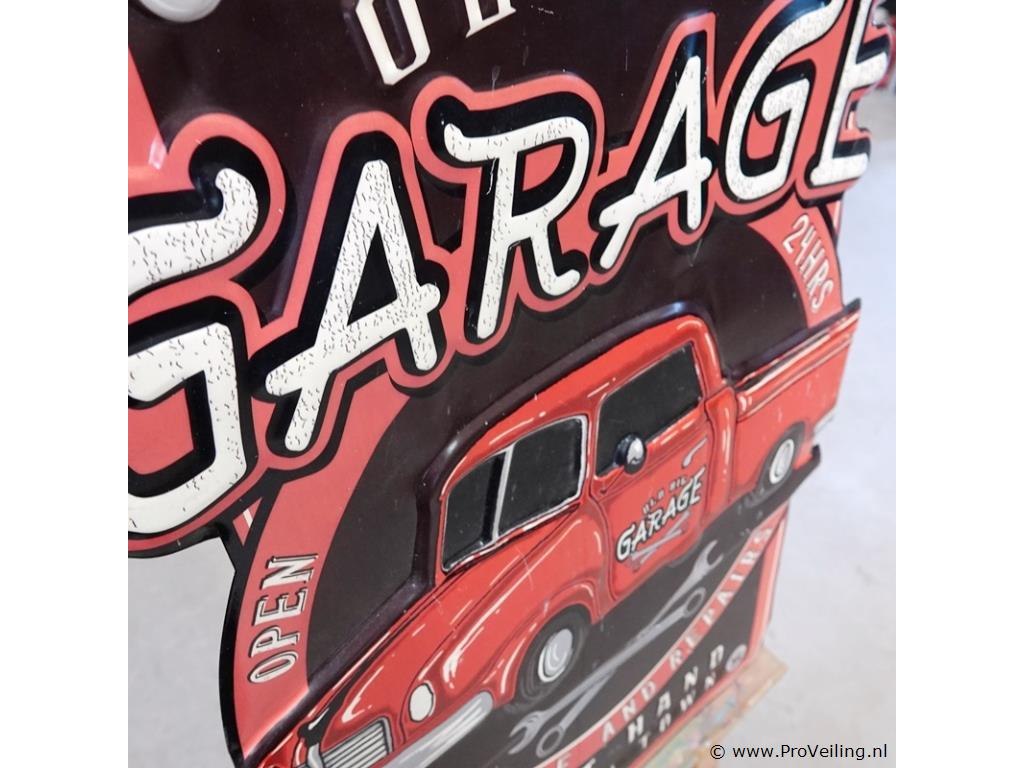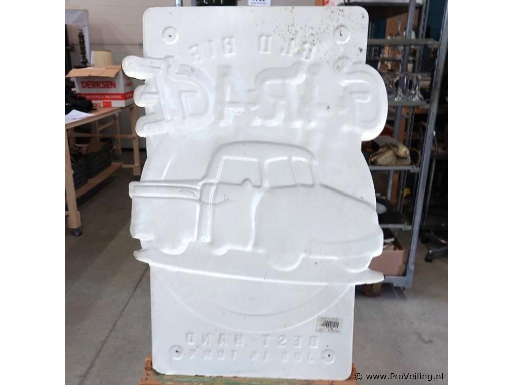 Groot metalen bord in reliëf Garage. H85cm/B57cm/2250Gr. Lees a.u.b. ook de extra veilinginformatie voor deze veiling. G-E-E-N transport of bezorging door Proveiling mogelijk. Eventueel transport of bezorging alleen door u zelf te regelen via b.v. www.brenger.nl .