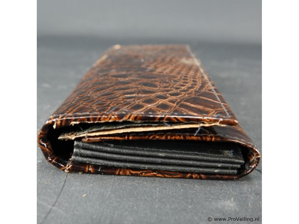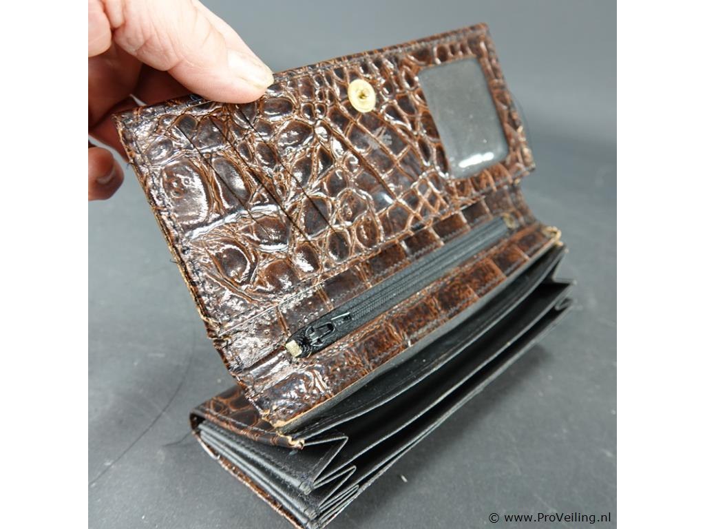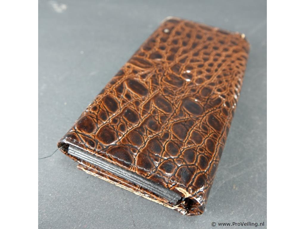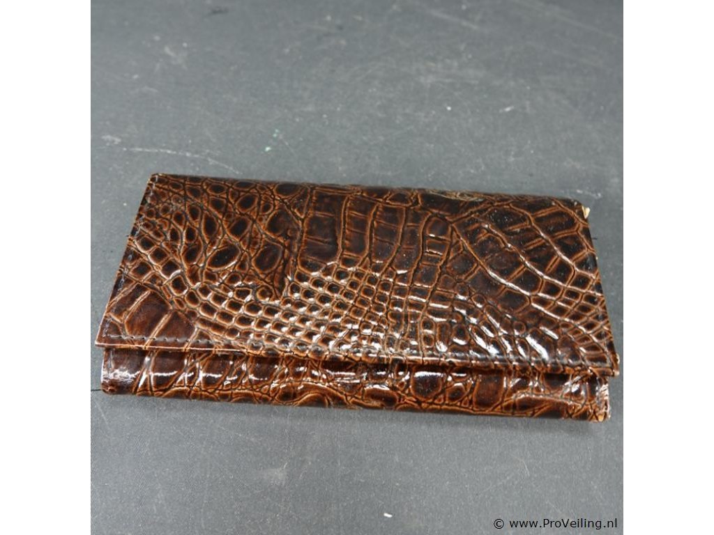 Portemonnee is gemaakt van materiaal met een krokodillen- of alligatormotief.