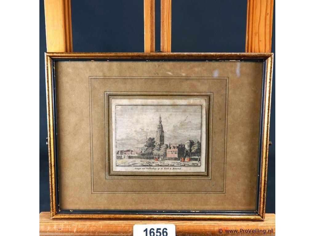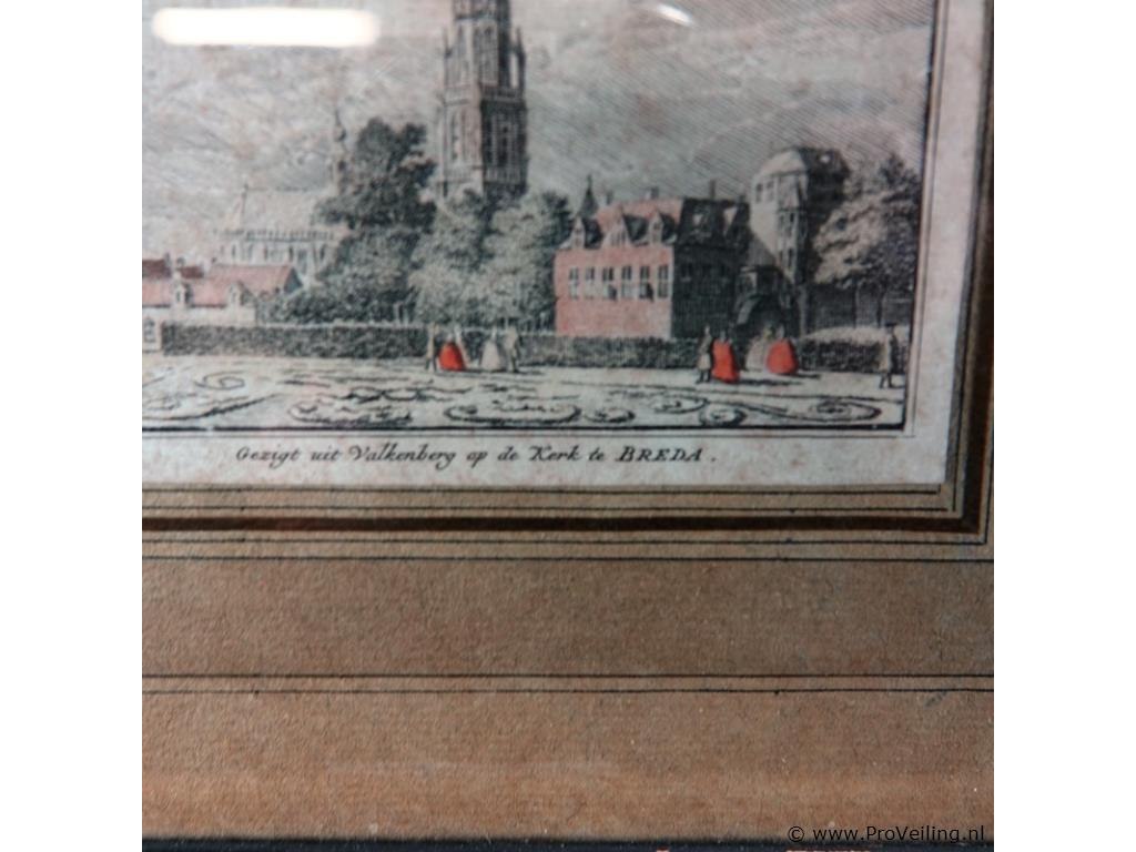 Antieke kleurendruk gezigt uit de valkenberg op de kerk te breda