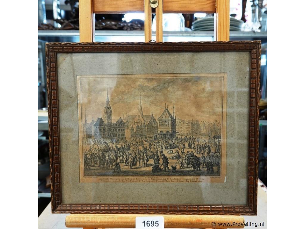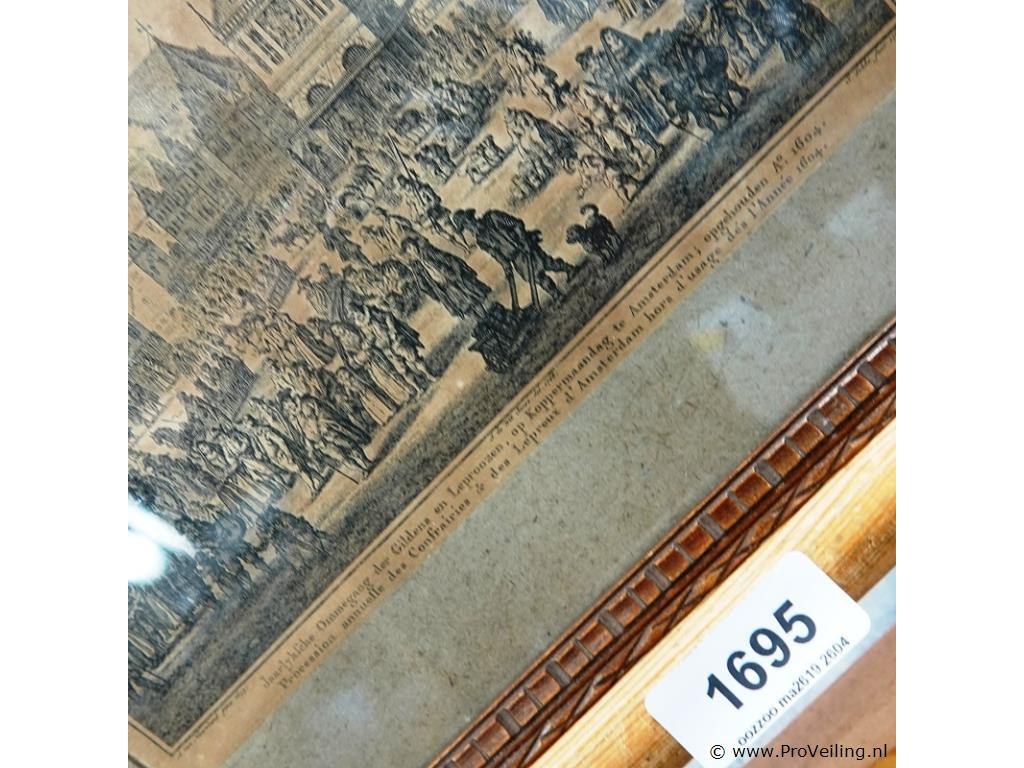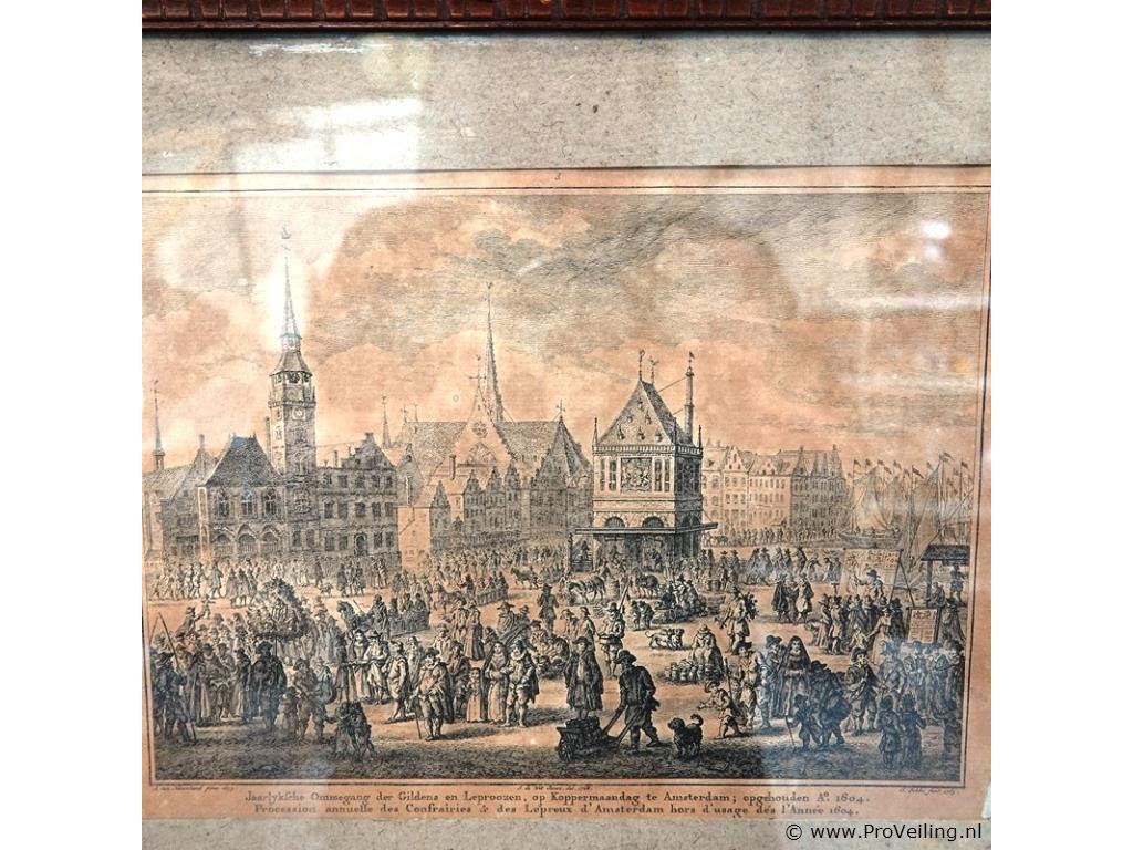 Antieke druk jaarlijkse ommegang der gilden en leproozen op koppersmaandag te amsterdam