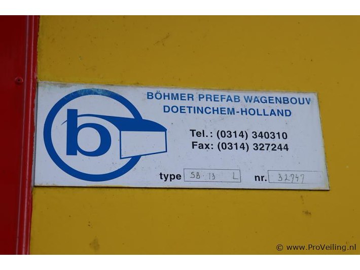 Böhmer bouwkeet/schaftwagen type SB-13 L 32947; afmetingen ca. 383x214x289cm; distel ca. 135cm; zie afbeeldingen. Attentie: het betreft hier een bouwkeet voor Langzaam verkeer.
