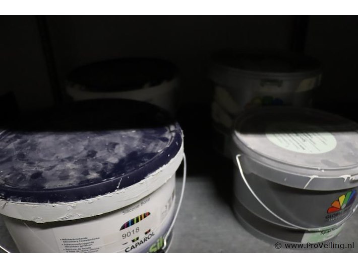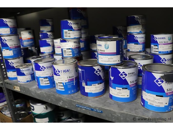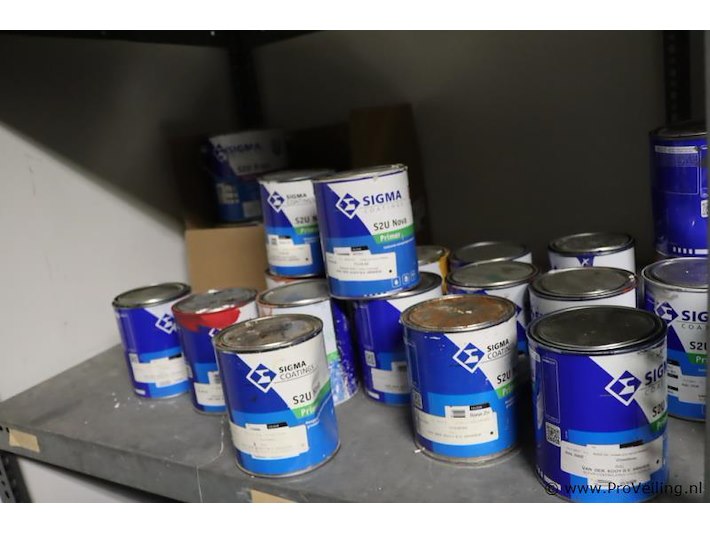 Partij verf bestaande uit o.a. sigma s2u nova grondverf, sikkens bl rezisto primer, veveo aqua titani zijdeglans, wijzonol wijzo chips-coll & global paint pu top satin