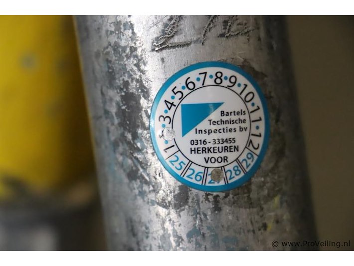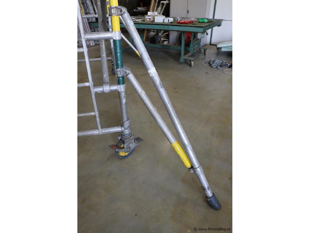 ; afmetingen ca. 140x245cm, hoogte ca. 6mtr; bestaande uit: *3x platform *2x stabilatoren *3x delen met trap *3x delen zonder trap *6x diagonale schoren *6x horizontale schoren *4x wielen