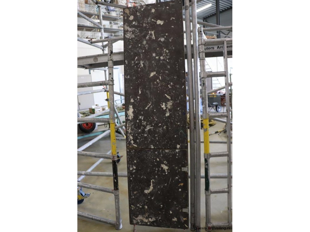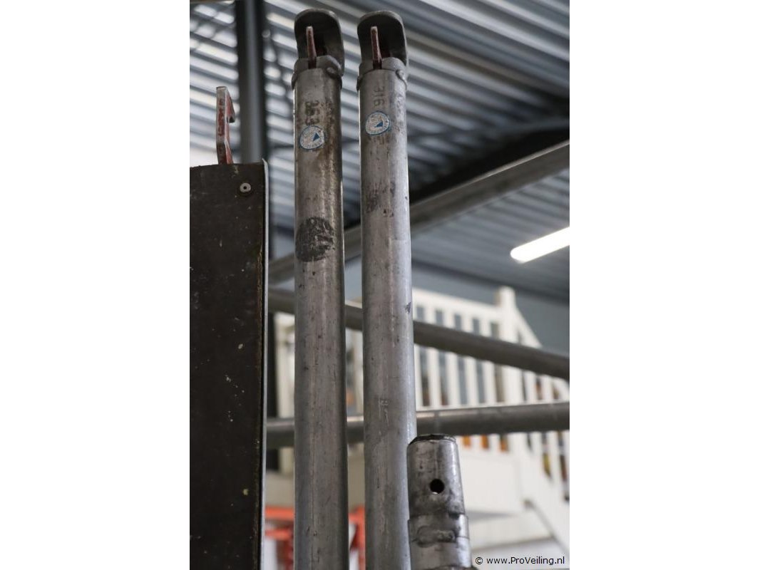 ; afmetingen ca. 140x245cm, hoogte ca. 6mtr; bestaande uit: *3x platform *2x stabilatoren *3x delen met trap *3x delen zonder trap *6x diagonale schoren *6x horizontale schoren *4x wielen