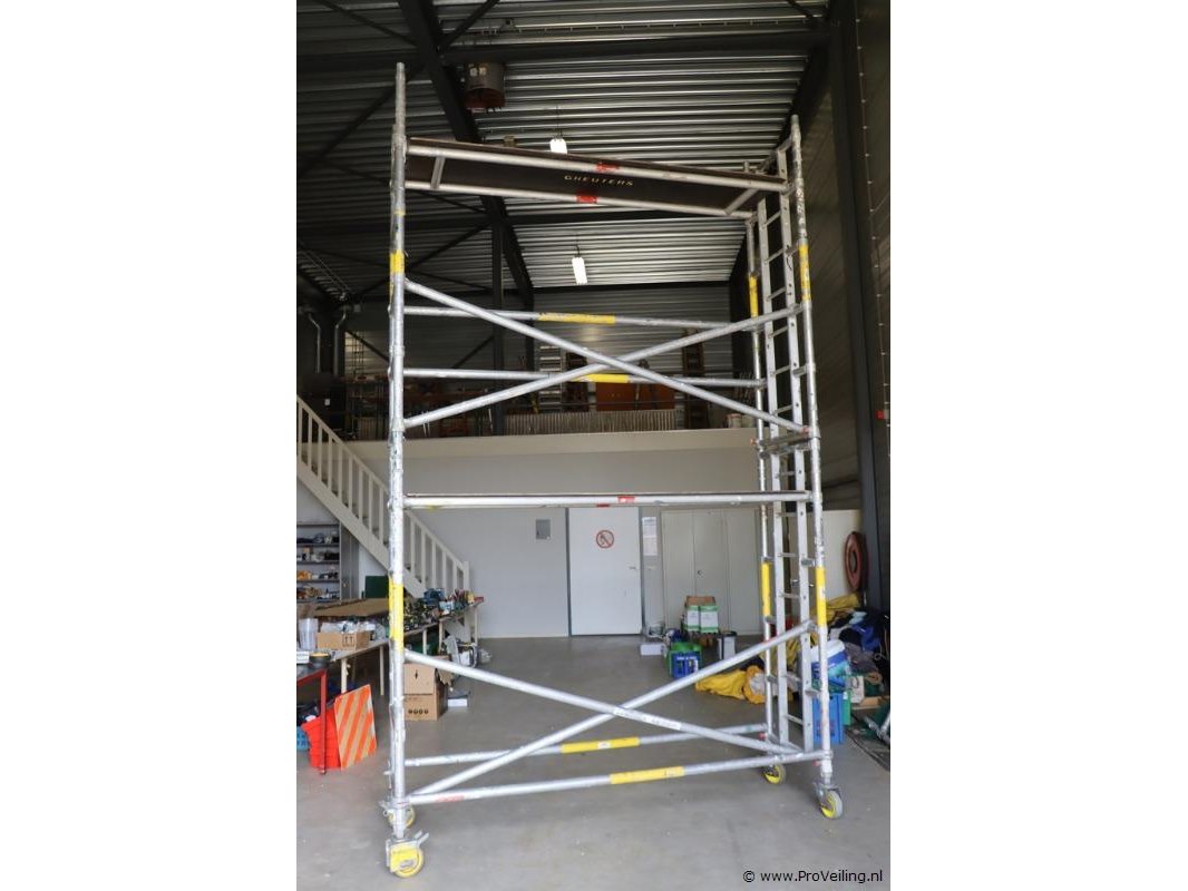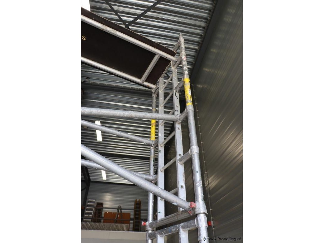 ; afmetingen ca. 70x140cm, hoogte ca. 4mtr; bestaande uit: *4x wielen *2x platform *4x diagonale schoren *4x horizontale schoren *2x delen met trap *2x delen zonder trap