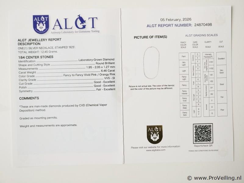 ALGT Report Number 24870498 Metal: 925 Silver Weight: 12.45 grams Measurements: 400x3x3mm Center Stone: Lab Grown Diamond 6.46 ct Fancy to Fancy Vivid Pink/Orangy Pink VVS-SI Shipping: Free insured shipping within the EU with track and trace Additional information: Some of the images are zoomed in. Please refer to the measurements for actual size Packaging: Comes with a jewelry box